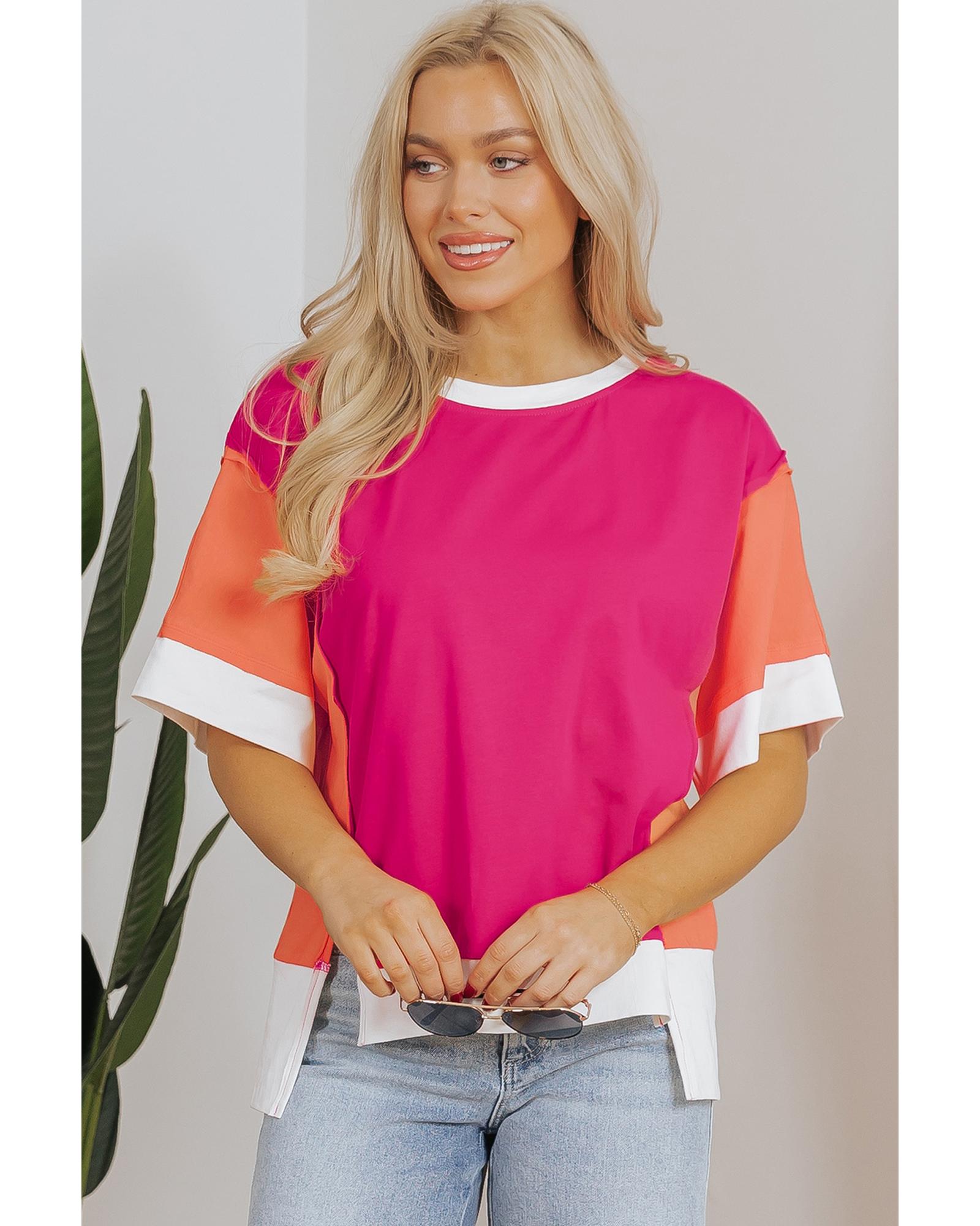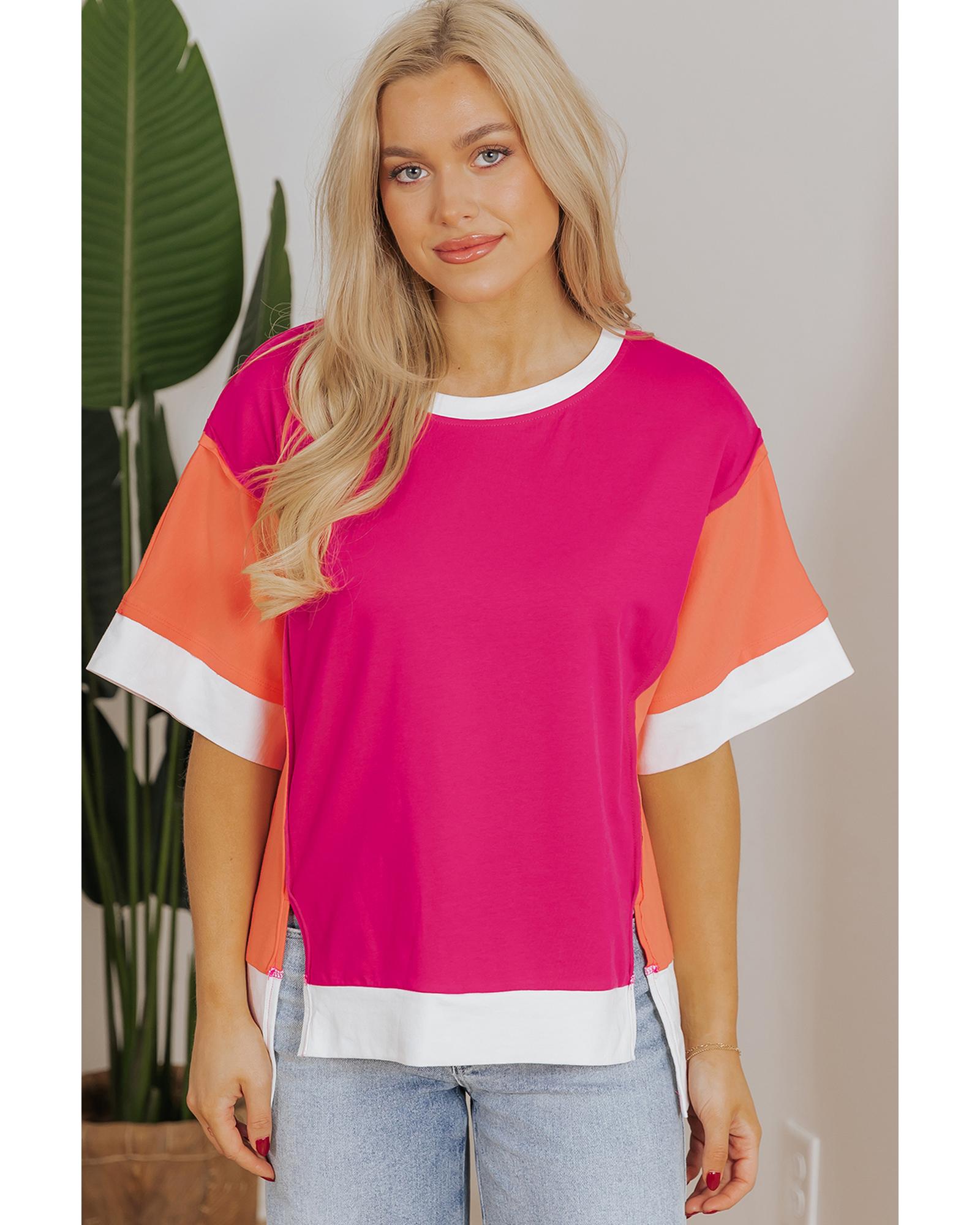 Rose Red Color Block Patchwork Side Slits Loose Fit T Shirt – XL
