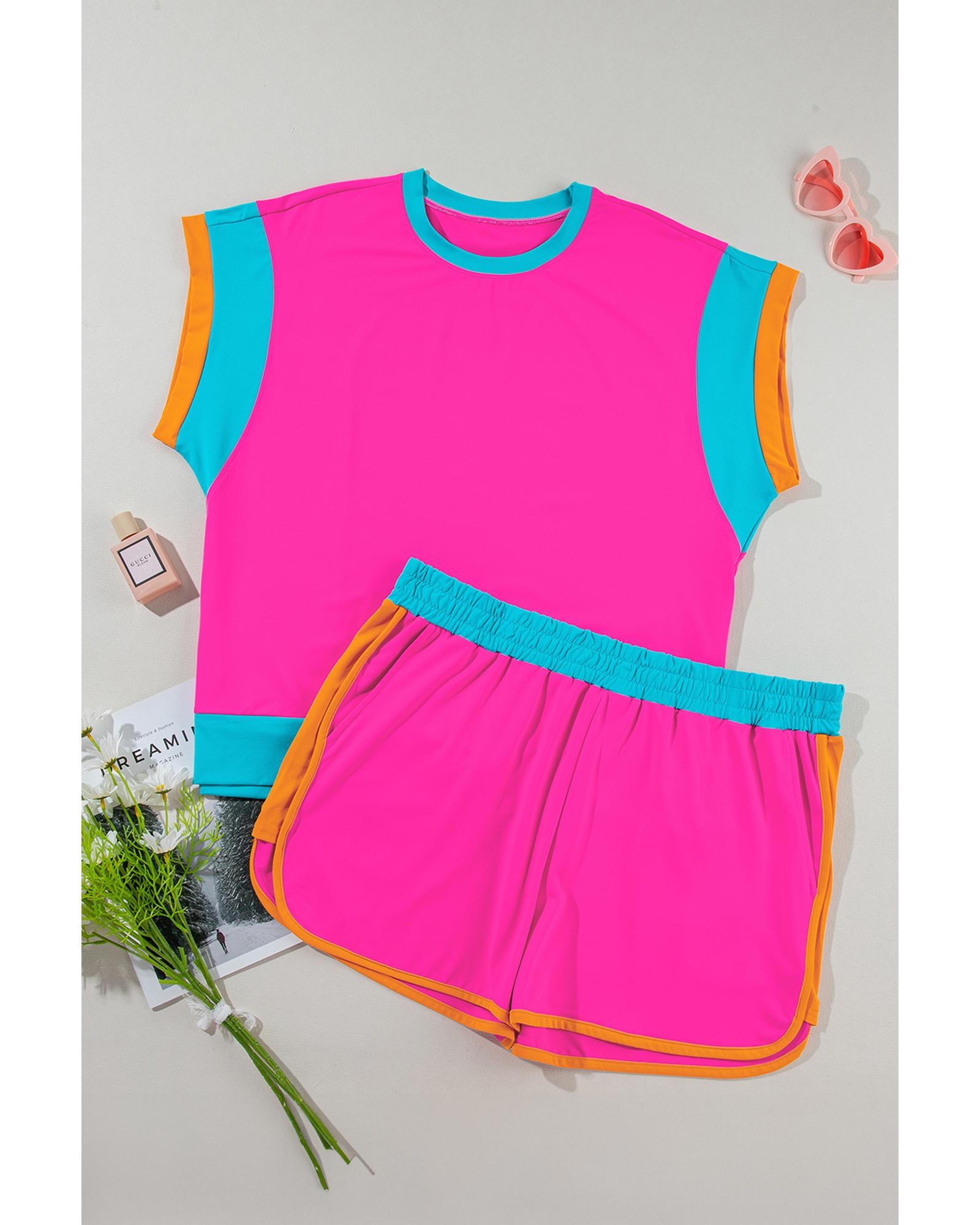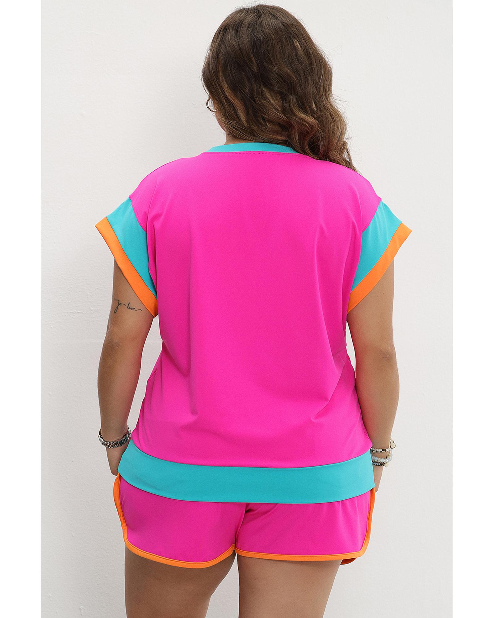 This stylish plus size shorts set features a vibrant rose red color with a colorblock patchwork design. The set includes a cap sleeve top and matching shorts, offering a trendy and comfortable look that can be worn together or separately. The contrast trim adds an extra touch of style, making it suitable for various casual occasions.
