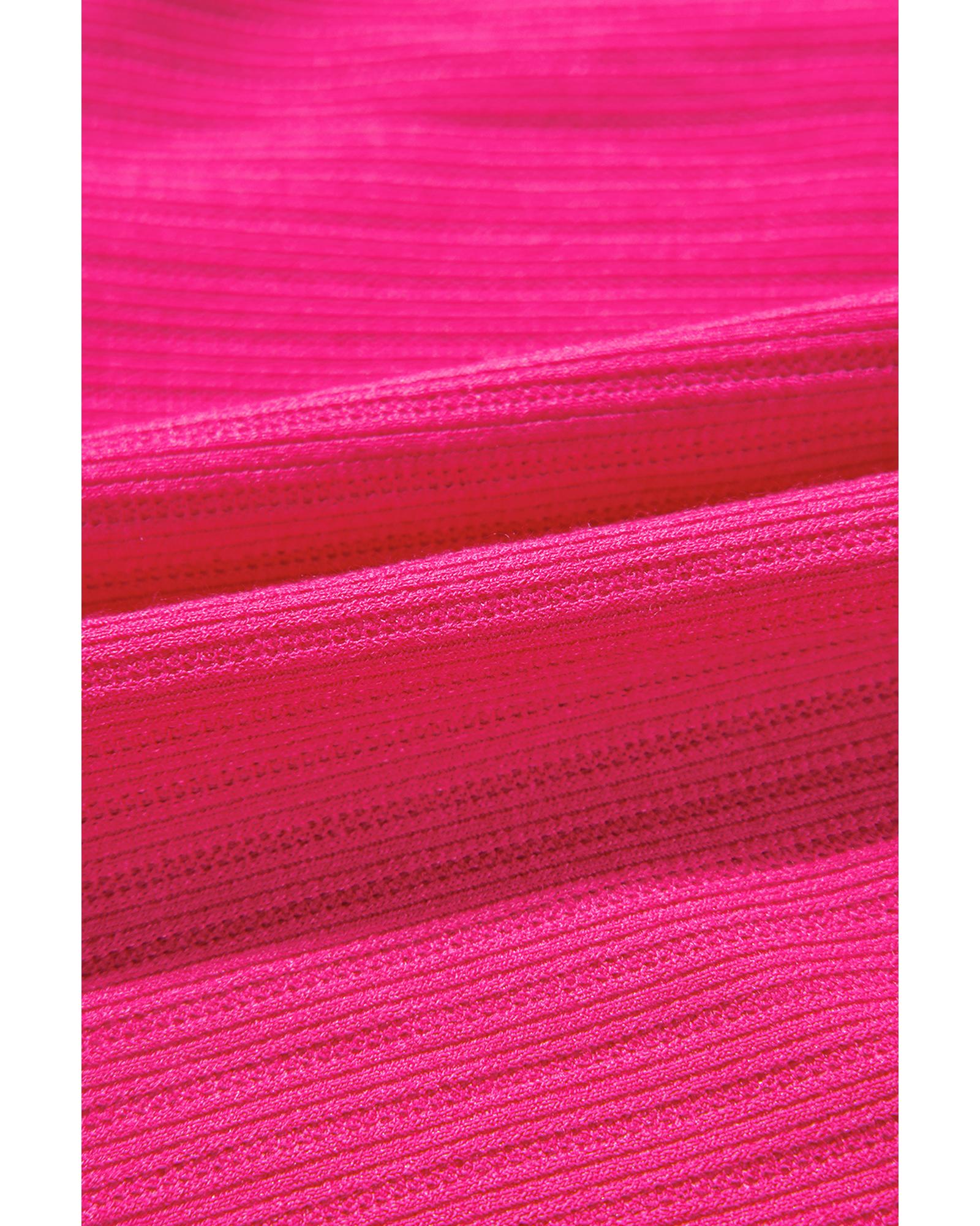 This colorful crochet mini dress features a vibrant rose red color with a textured fabric design. It is crafted with a V neckline, long sleeves, and a tiered, ruffled hem, creating a stylish and feminine silhouette. The dress offers high elasticity for a comfortable fit and is suitable for various occasions.
