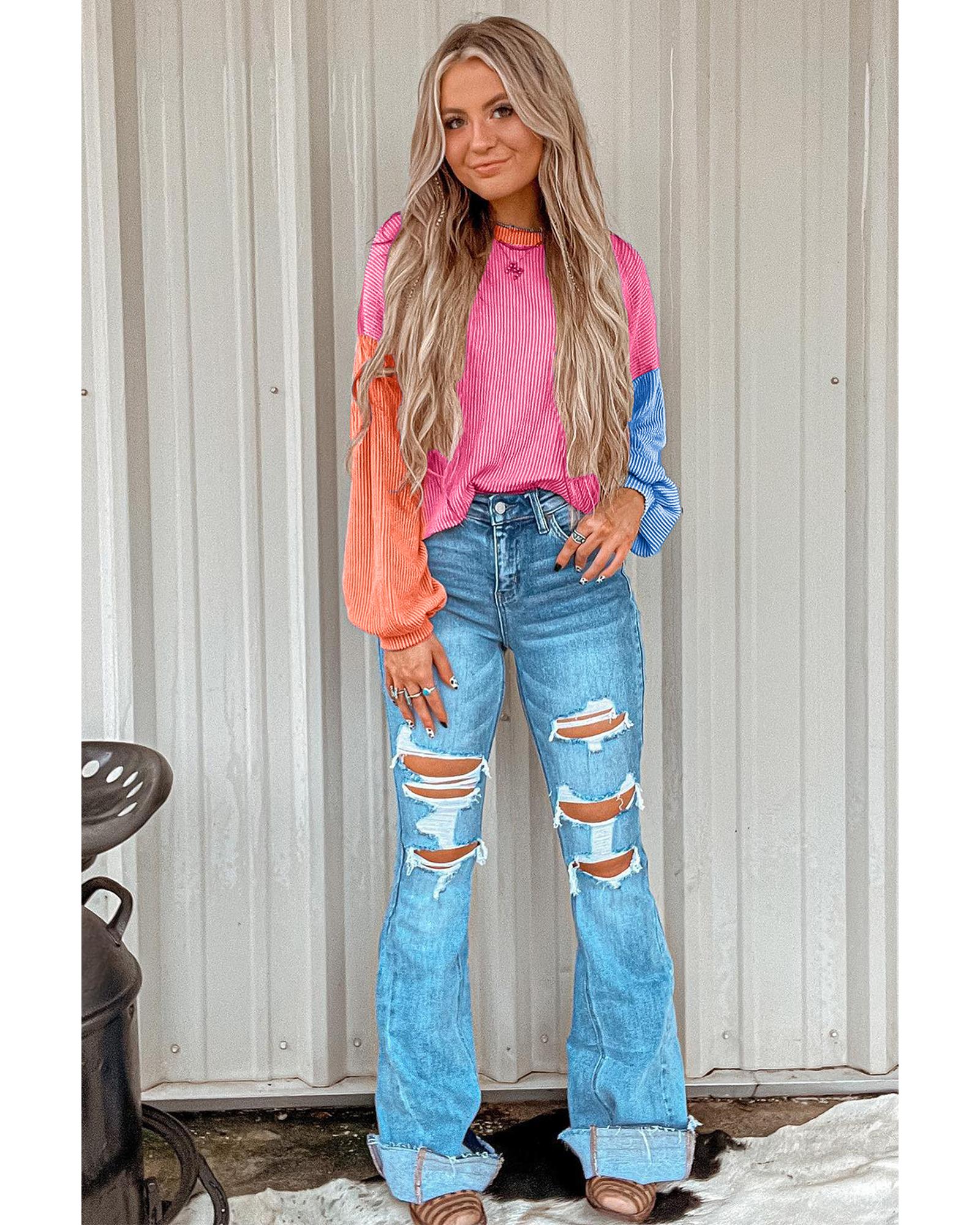 Rose Red Corded Colorblock Patchwork Drop Shoulder Long Sleeve Top – XL