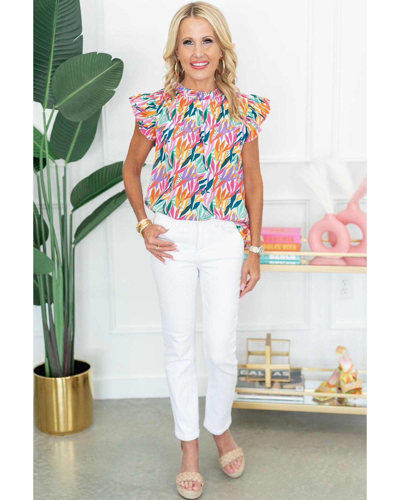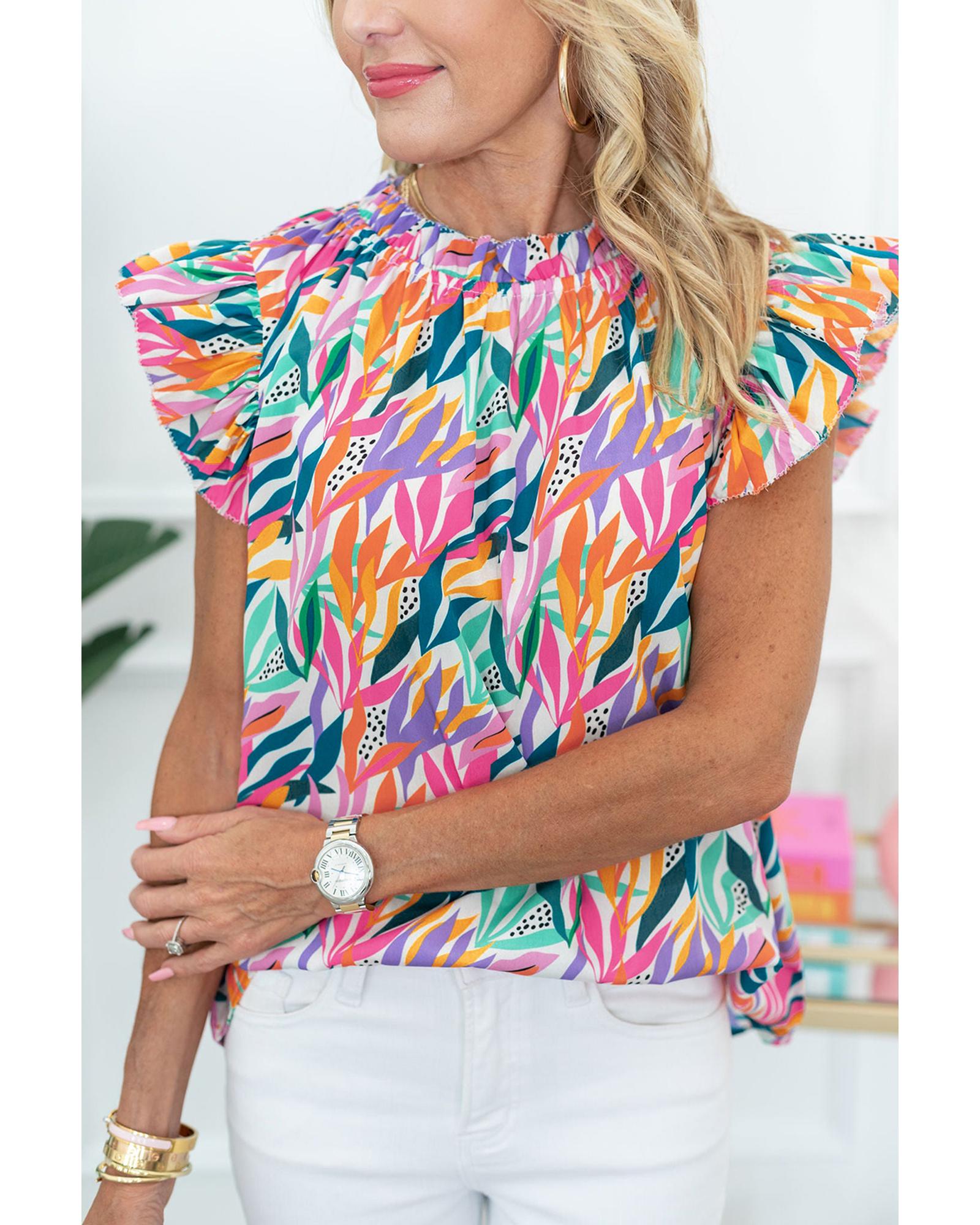 This floral print blouse features a vibrant rose red pattern with a ruffled design and flutter sleeves, offering a stylish and feminine look suitable for various occasions. Its modest mock neck adds a touch of elegance, making it perfect for daily wear, parties, or dates.