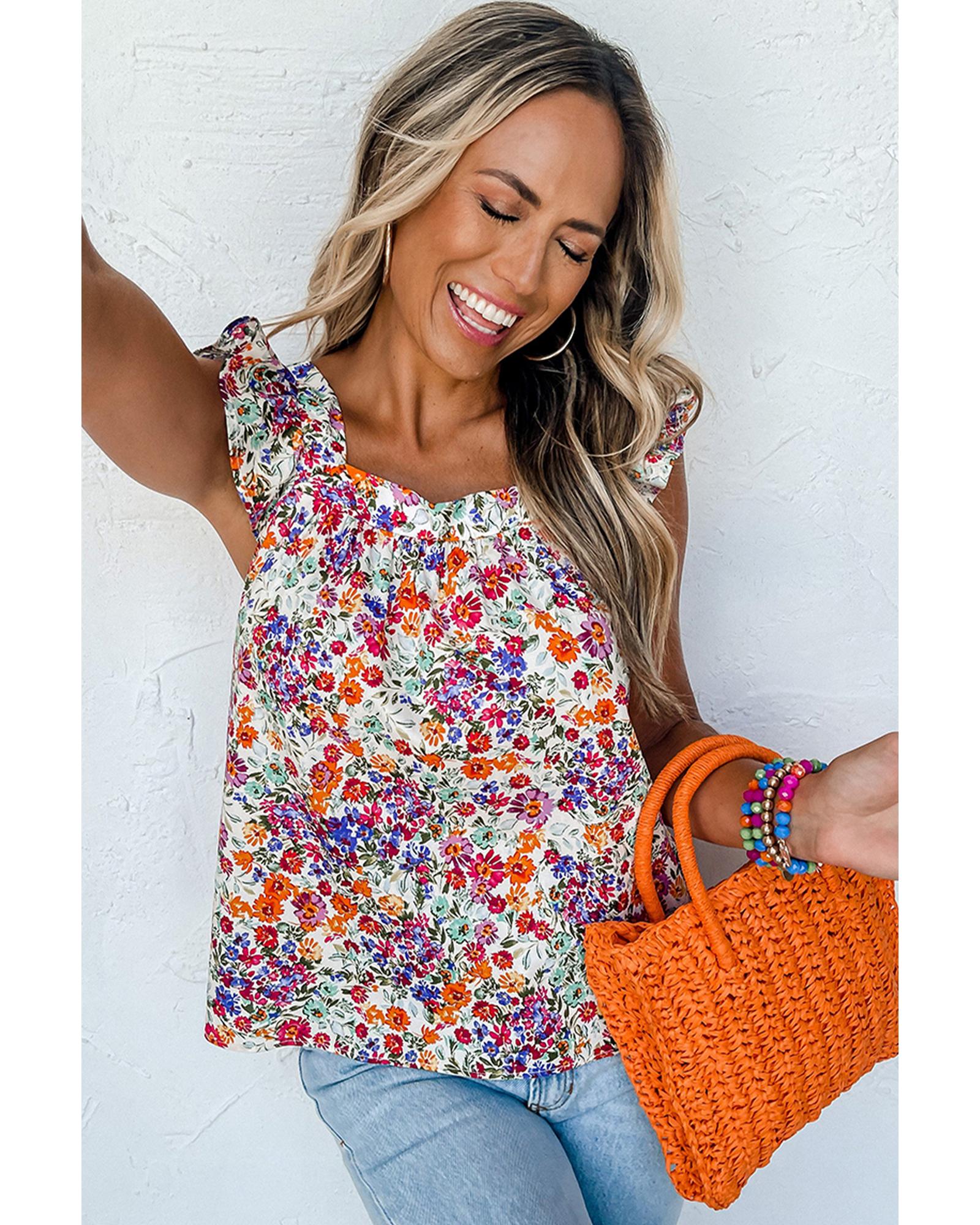This floral square neck flutter tank top features a vibrant floral print and a relaxed fit, making it a stylish and comfortable choice for summer wear. Its breathable fabric ensures comfort during warm days, and the design is easy to pair with various bottoms such as shorts, jeans, or skirts.