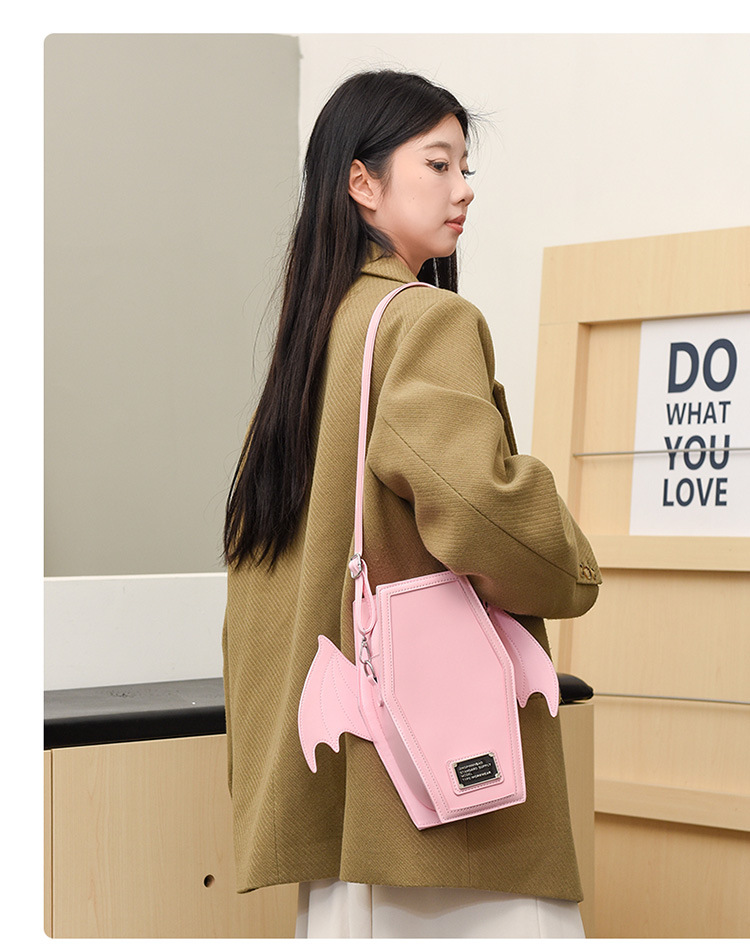 This gothic-inspired coffin bag features a unique design with bat wing accents, perfect for expressing alternative and dark fashion styles. Made from high-quality PU leather, it offers a versatile and practical accessory for daily use, combining striking aesthetics with functionality.