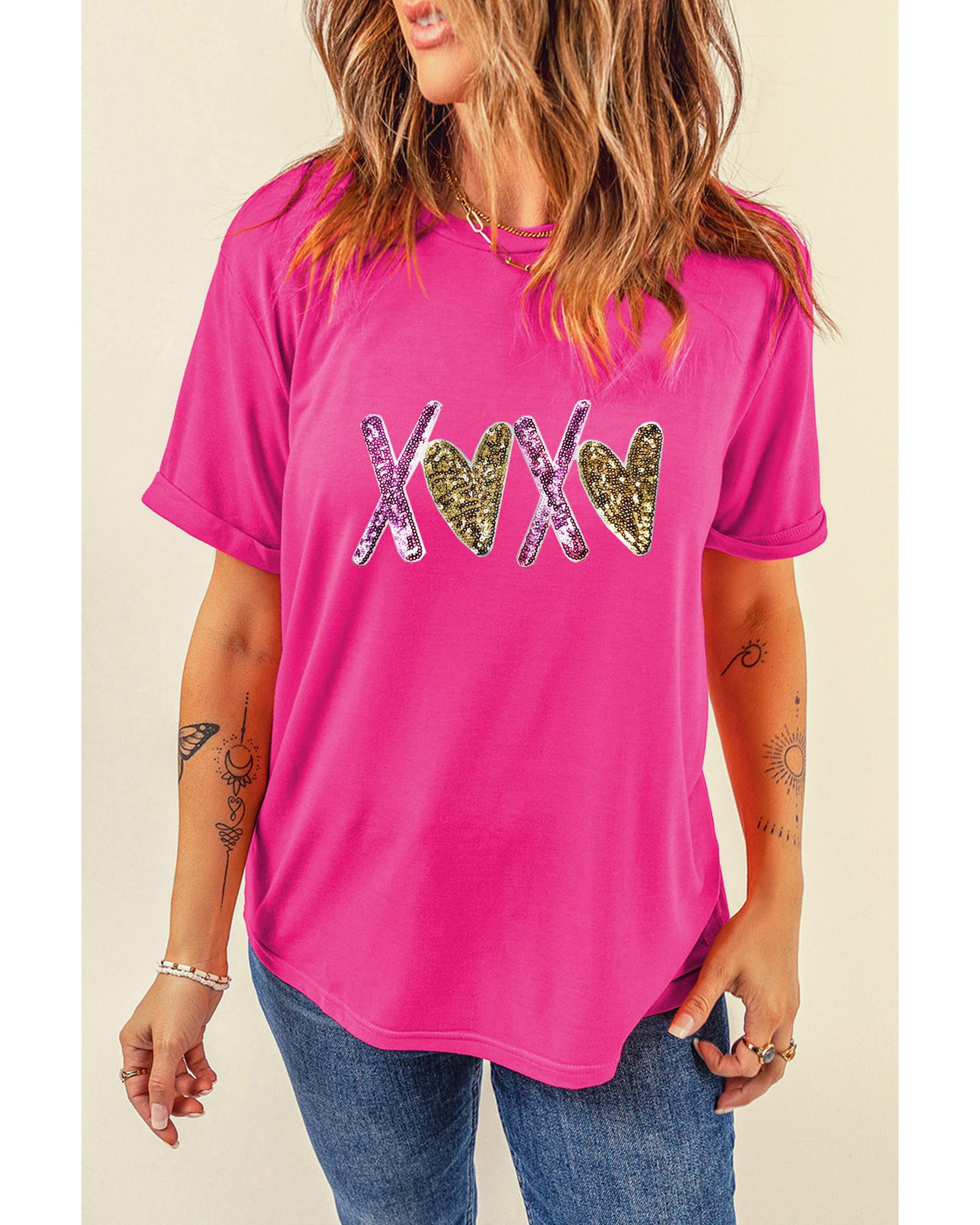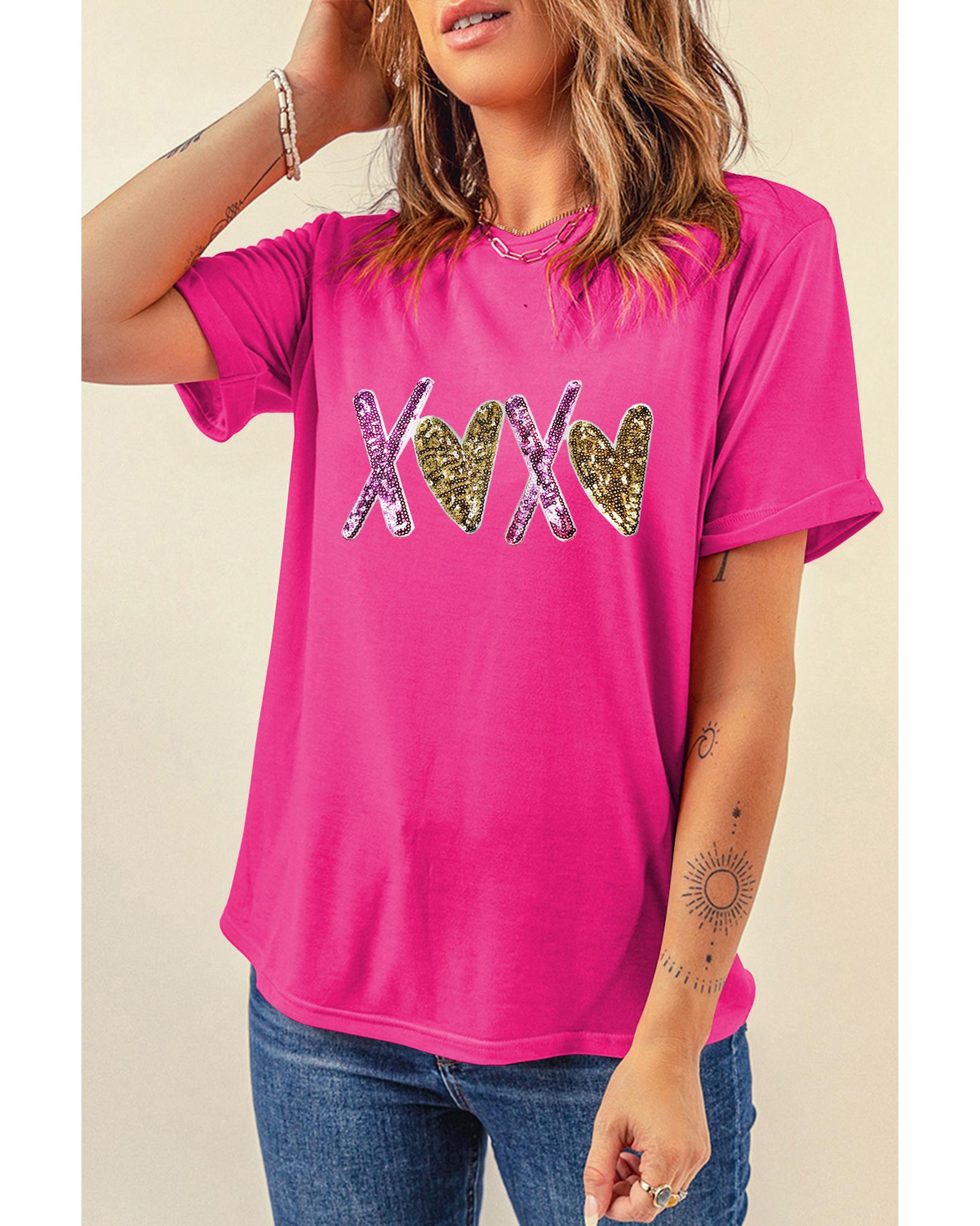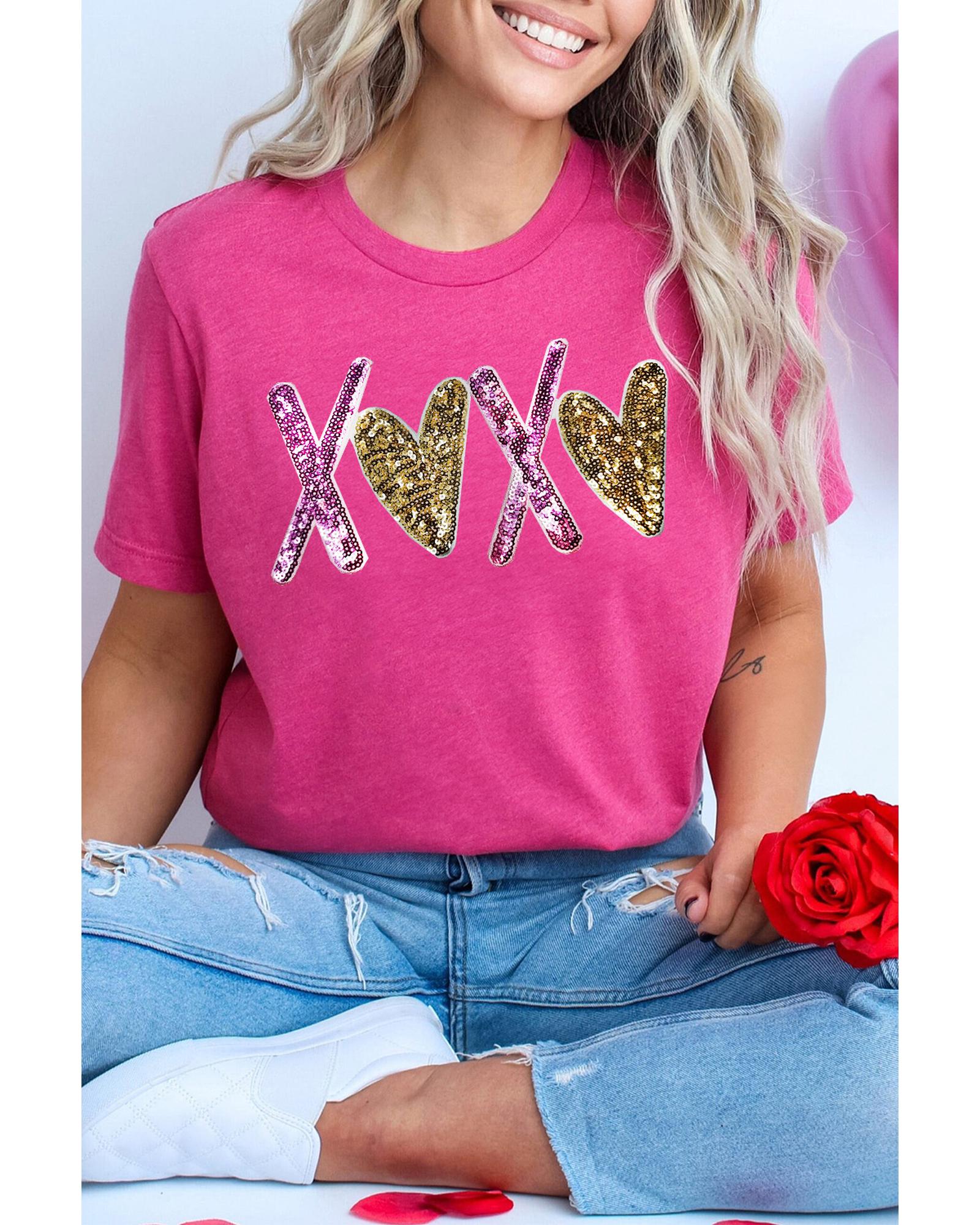 This Valentines T-shirt features a playful heart and XOXO graphic design, making it a charming addition to your wardrobe. Its classic crew neck style offers comfort and versatility, perfect for celebrating special occasions or adding a romantic touch to your everyday look.