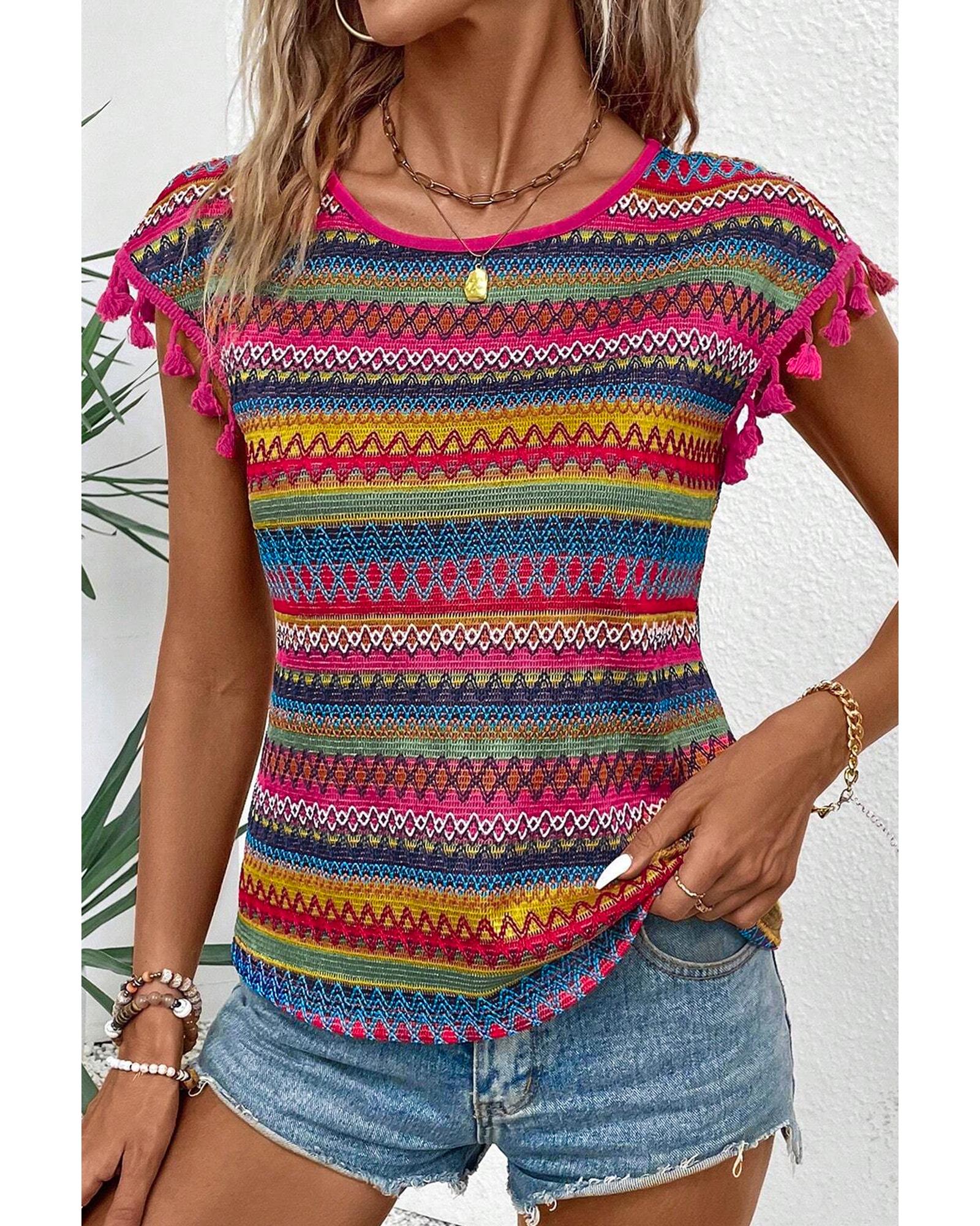 Rose Red Jacquard Textured Tasseled Cap Sleeve Top – XL