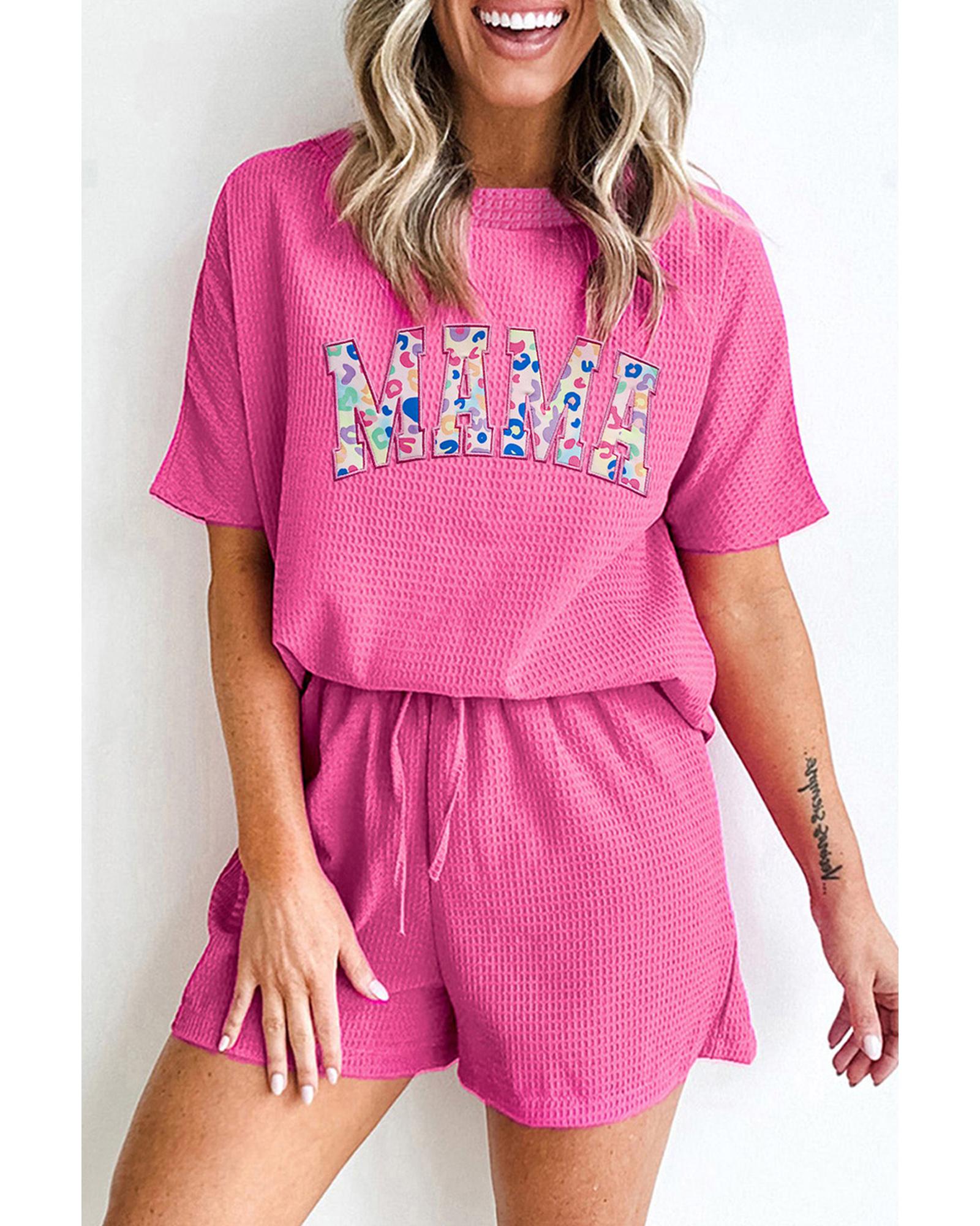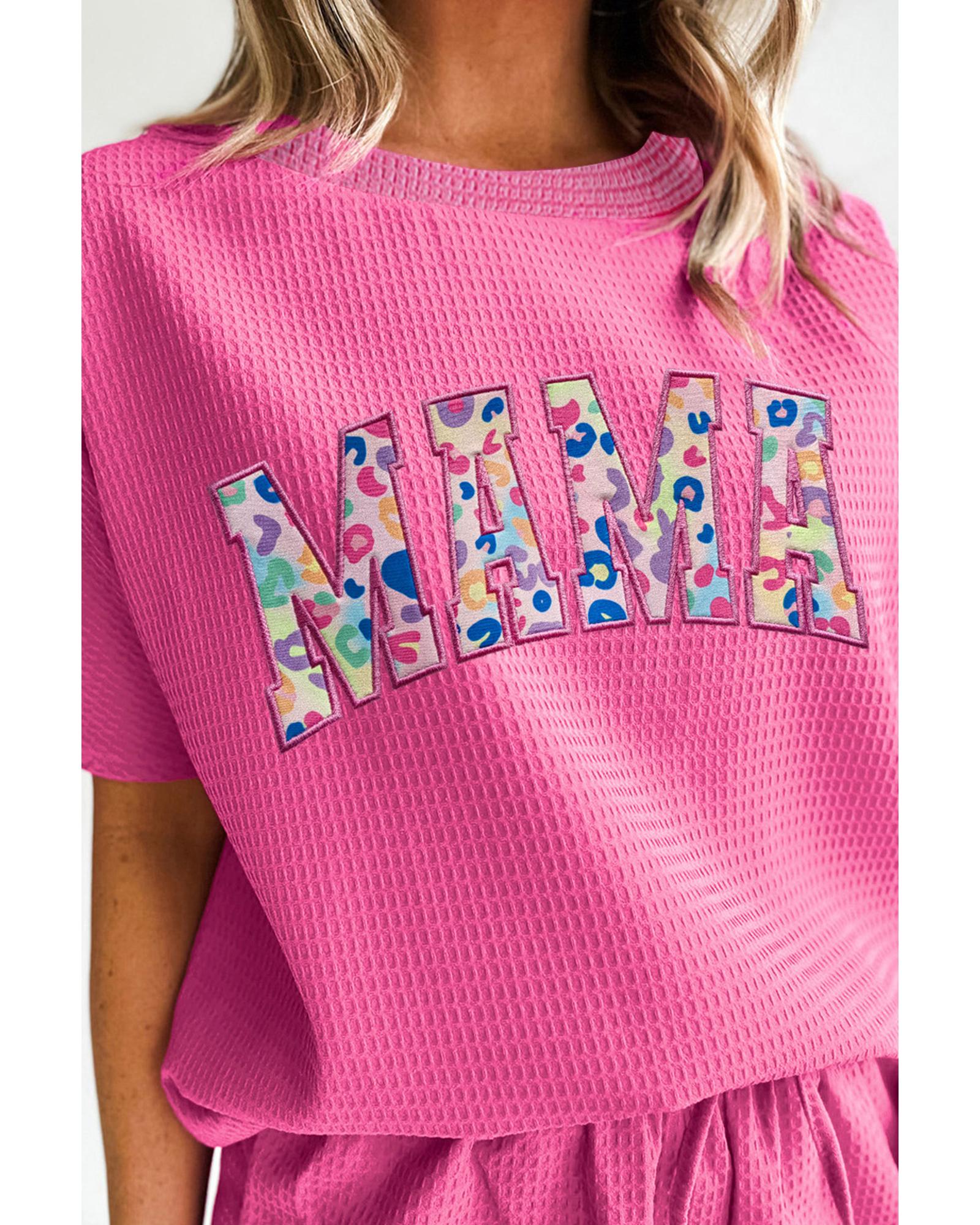 Rose Red MAMA Embroidered Leopard Letters Waffle Short Set – S