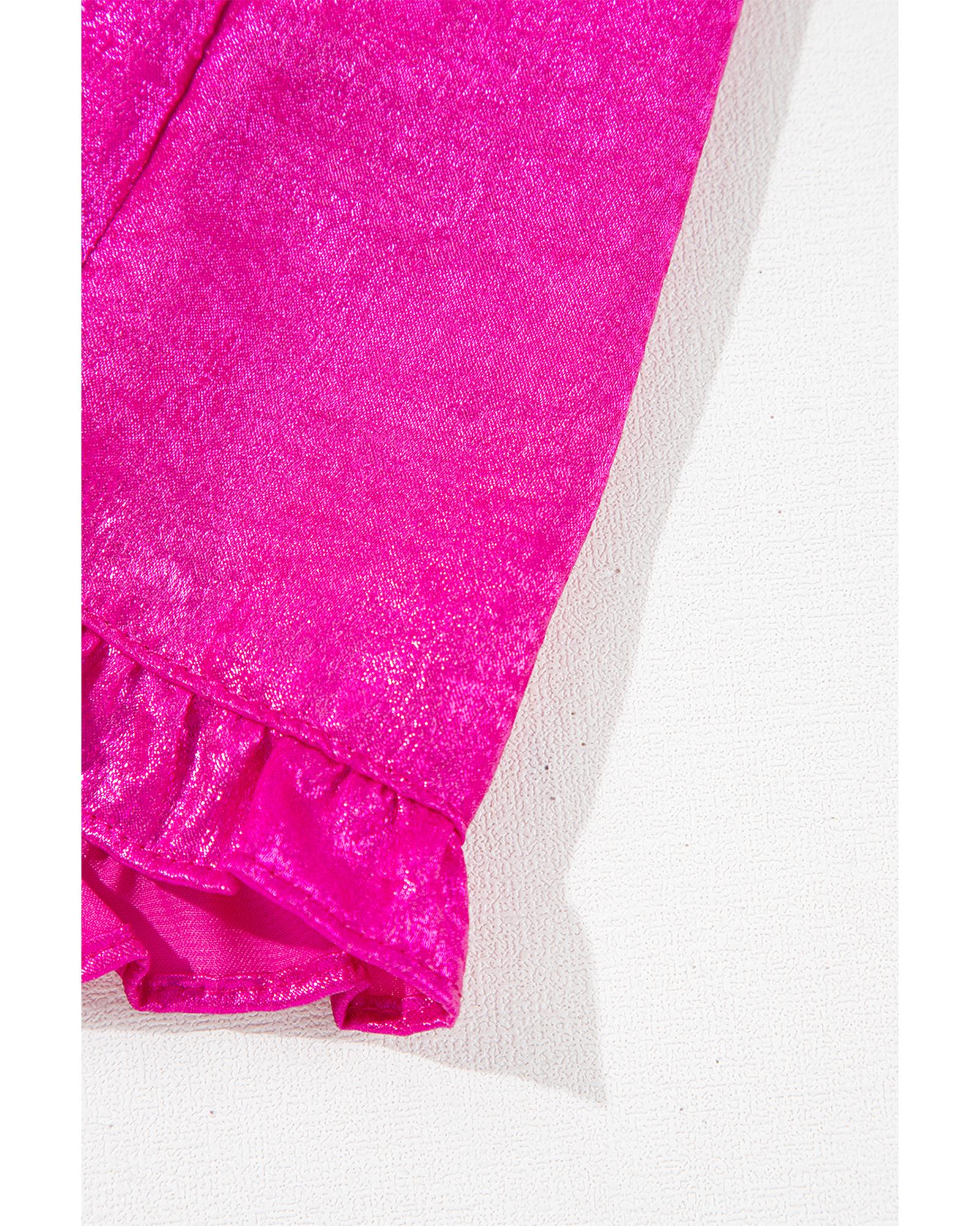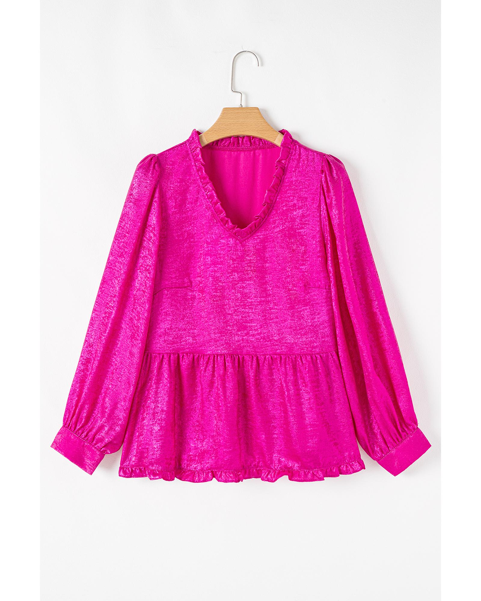 This stylish blouse features a vibrant rose red metallic finish, designed to enhance your wardrobe with a trendy and elegant touch. The frilled V neckline and puff sleeves create a flattering silhouette, making it perfect for various occasions.
