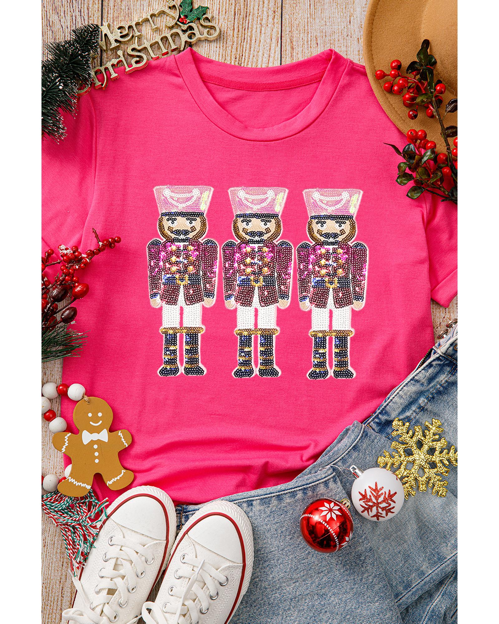 This festive holiday T-shirt features a playful Nutcracker graphic in a vibrant rose red color, perfect for celebrating the Christmas season. Designed with a trendy fitted style, it offers a comfortable fit suitable for casual wear during the holidays.