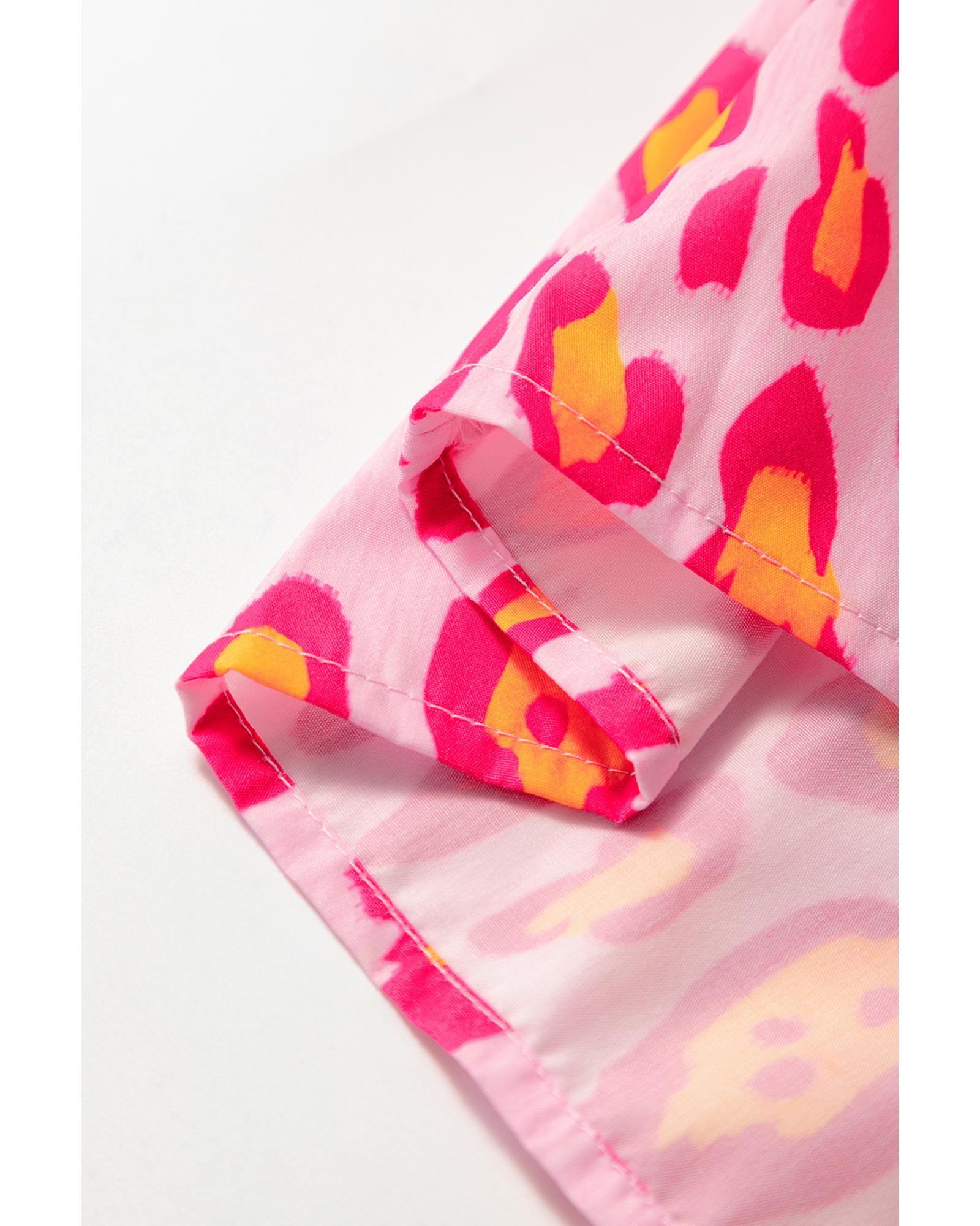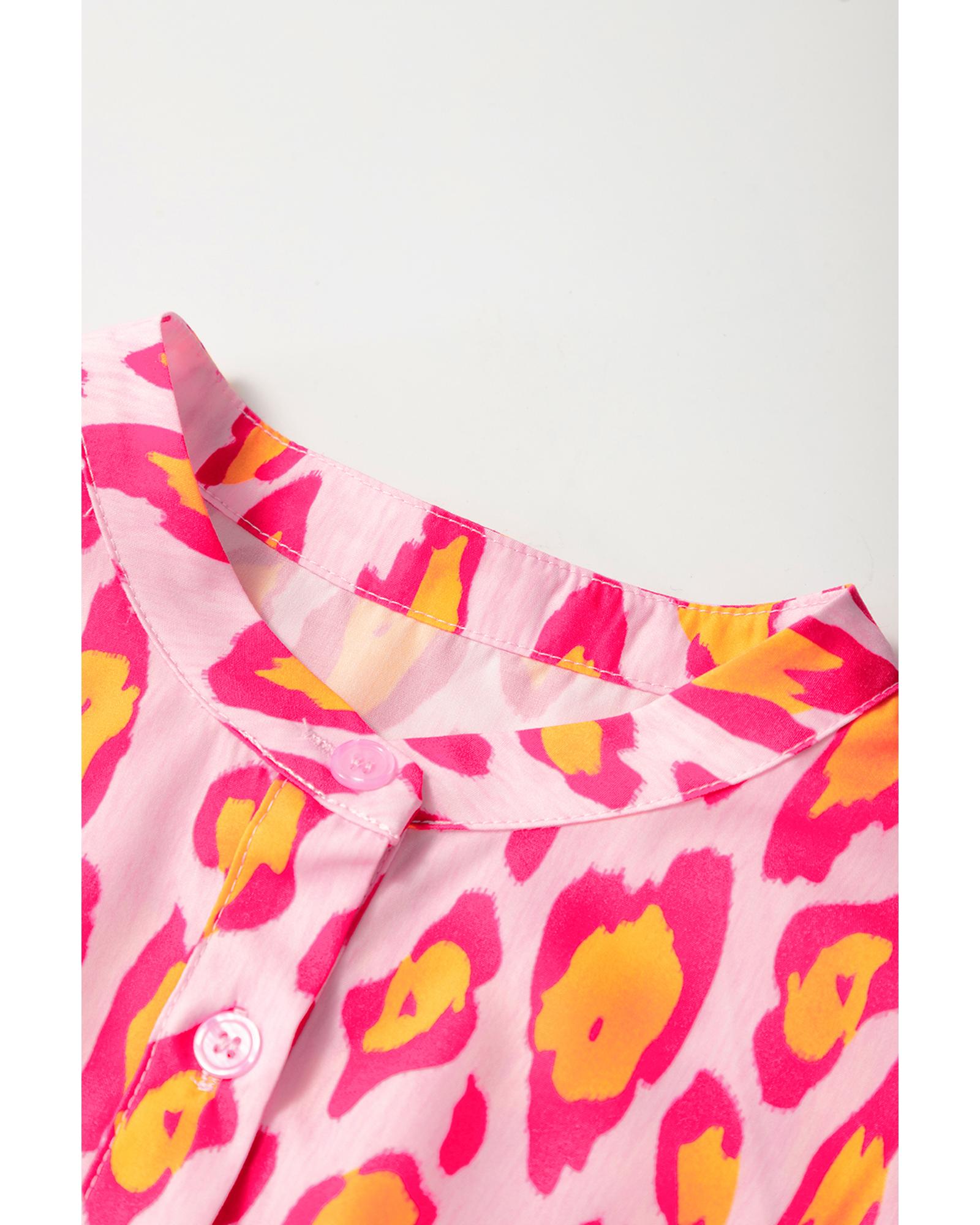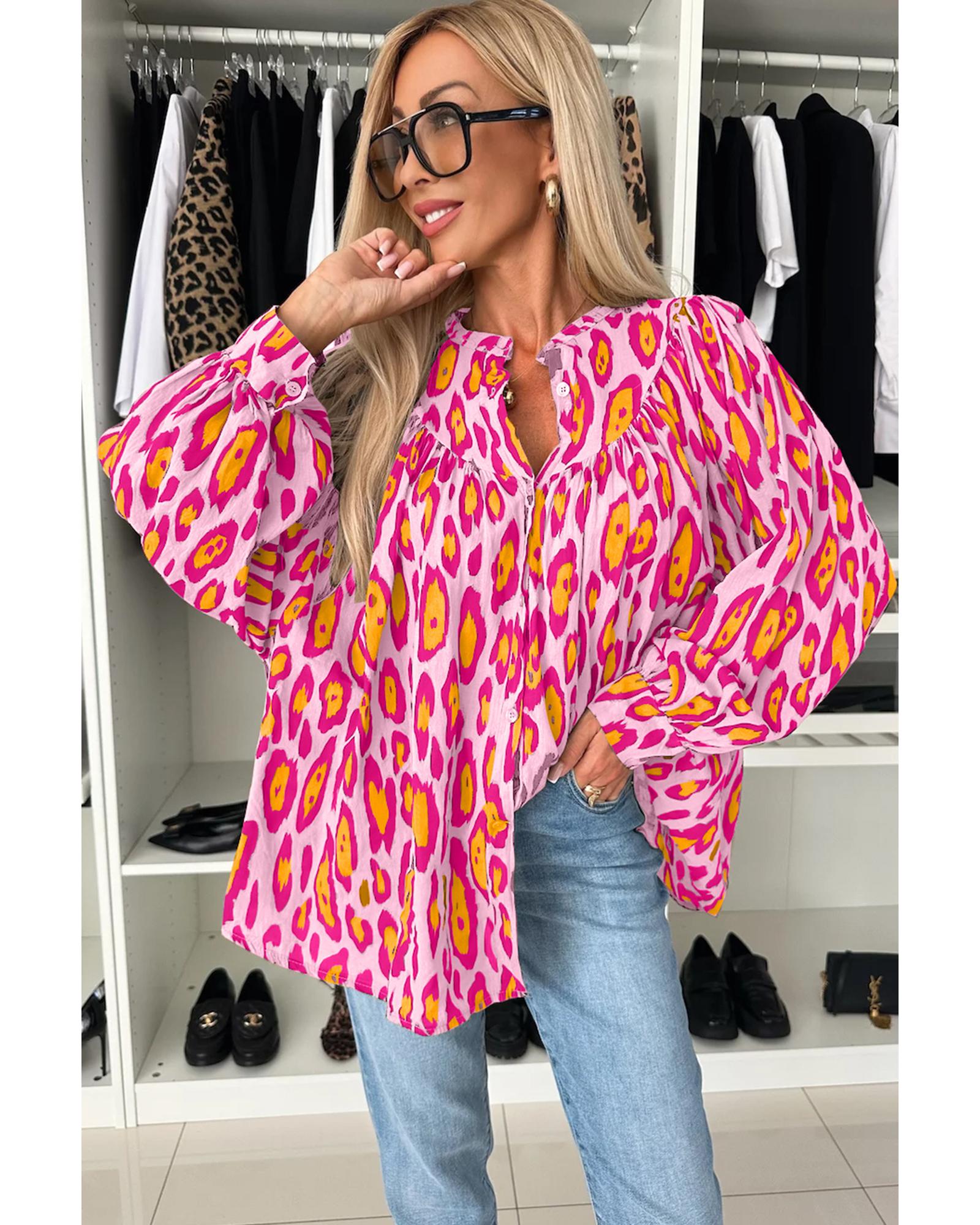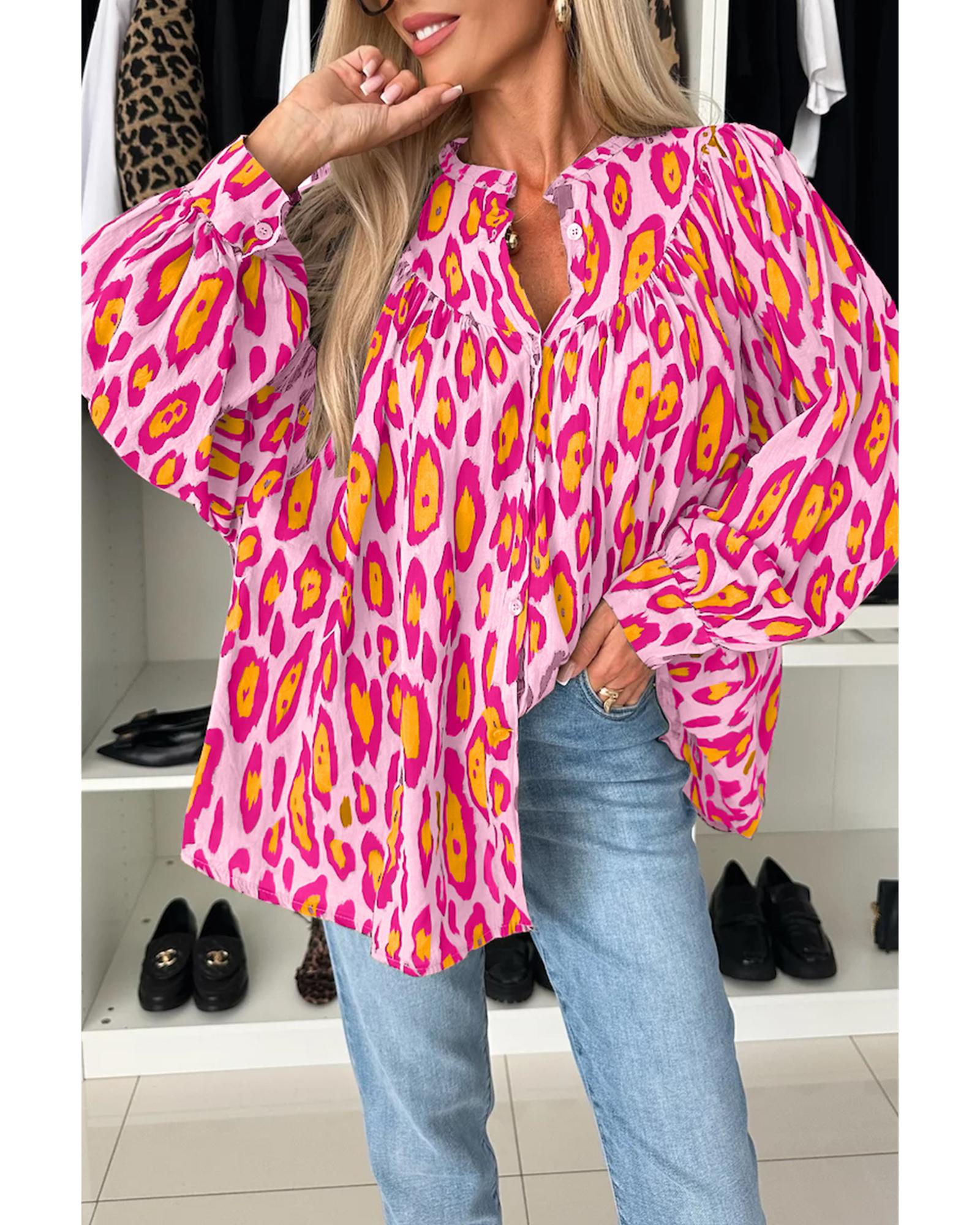 Rose Red Oversized Leopard Print Balloon Sleeve Casual Shirt – M
