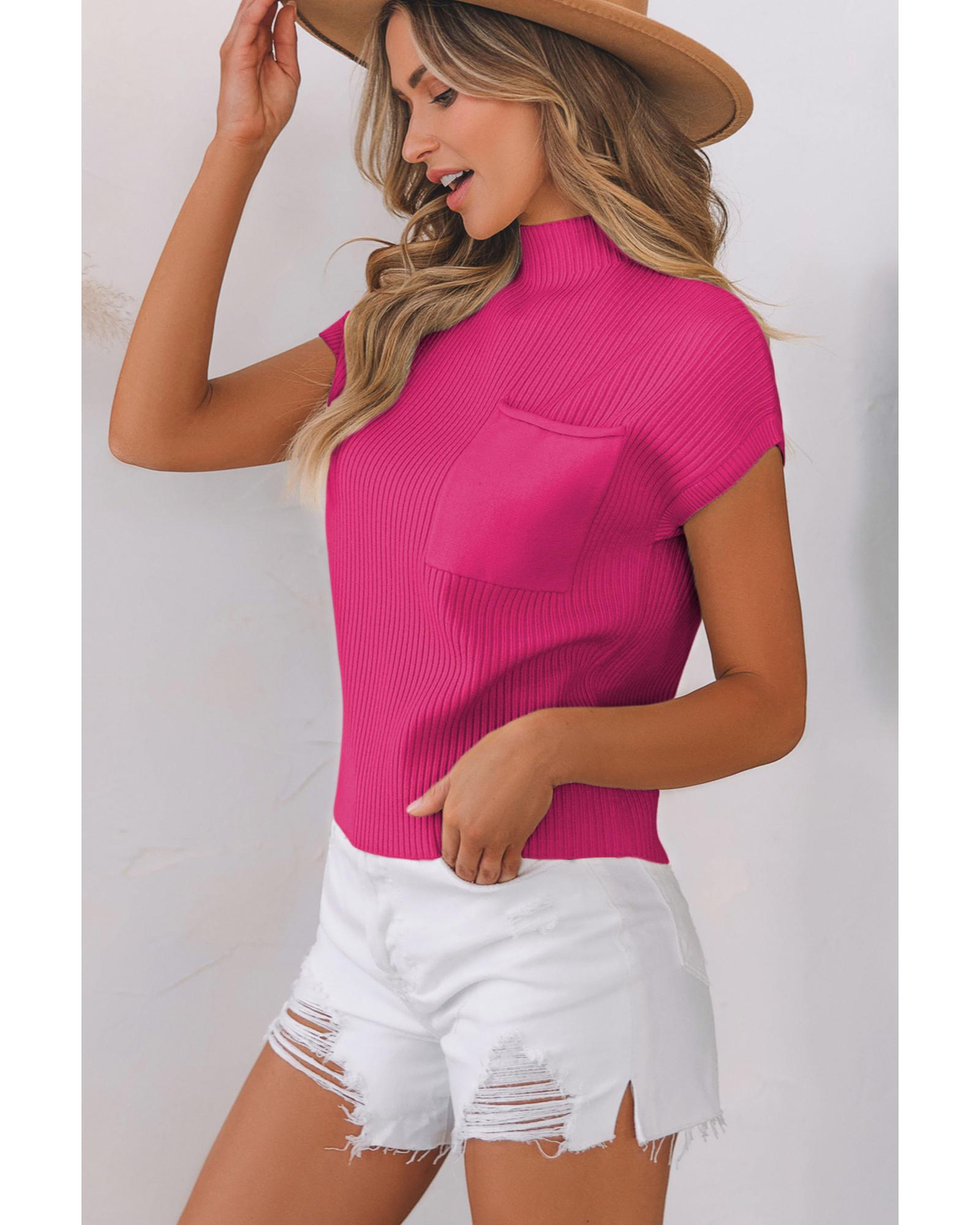 This short sleeve sweater features a ribbed knit texture combined with a patch pocket, offering a cozy and stylish appearance. Designed with a trendy fitted silhouette, it provides both comfort and versatility for everyday wear. Available in multiple colors, it can easily match various personal styles.