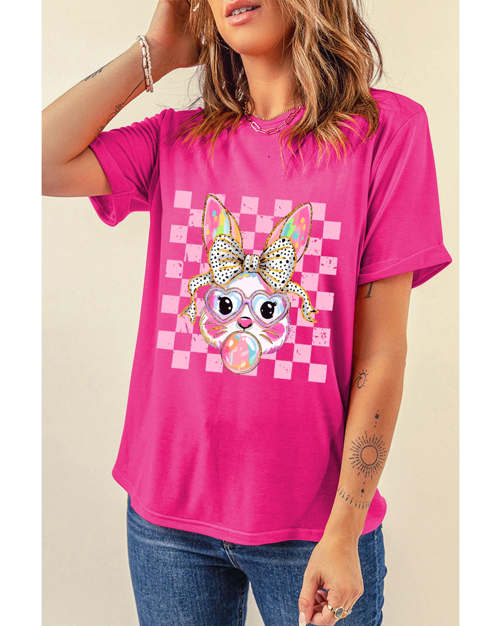 This T-shirt features a vibrant rose red plaid pattern combined with a playful rabbit graphic blowing bubble gum, creating a fun and eye-catching look. Designed with comfort in mind, it offers a relaxed fit suitable for casual wear. The soft, breathable fabric ensures all-day comfort.