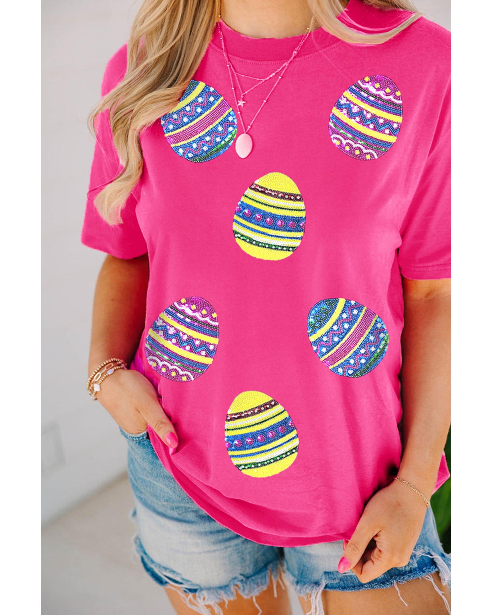 Rose Red Sequin Easter Egg Graphic Casual T Shirt – L