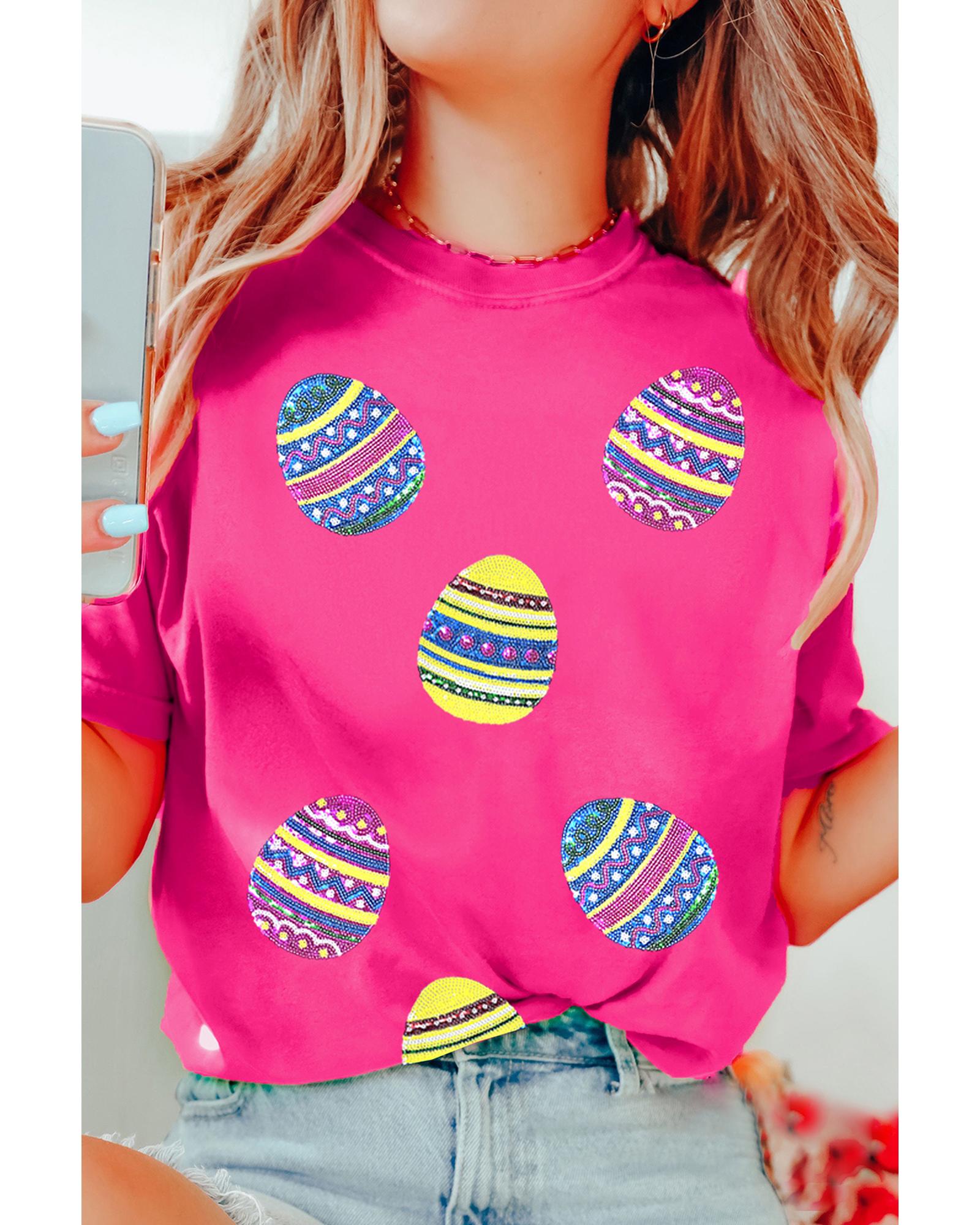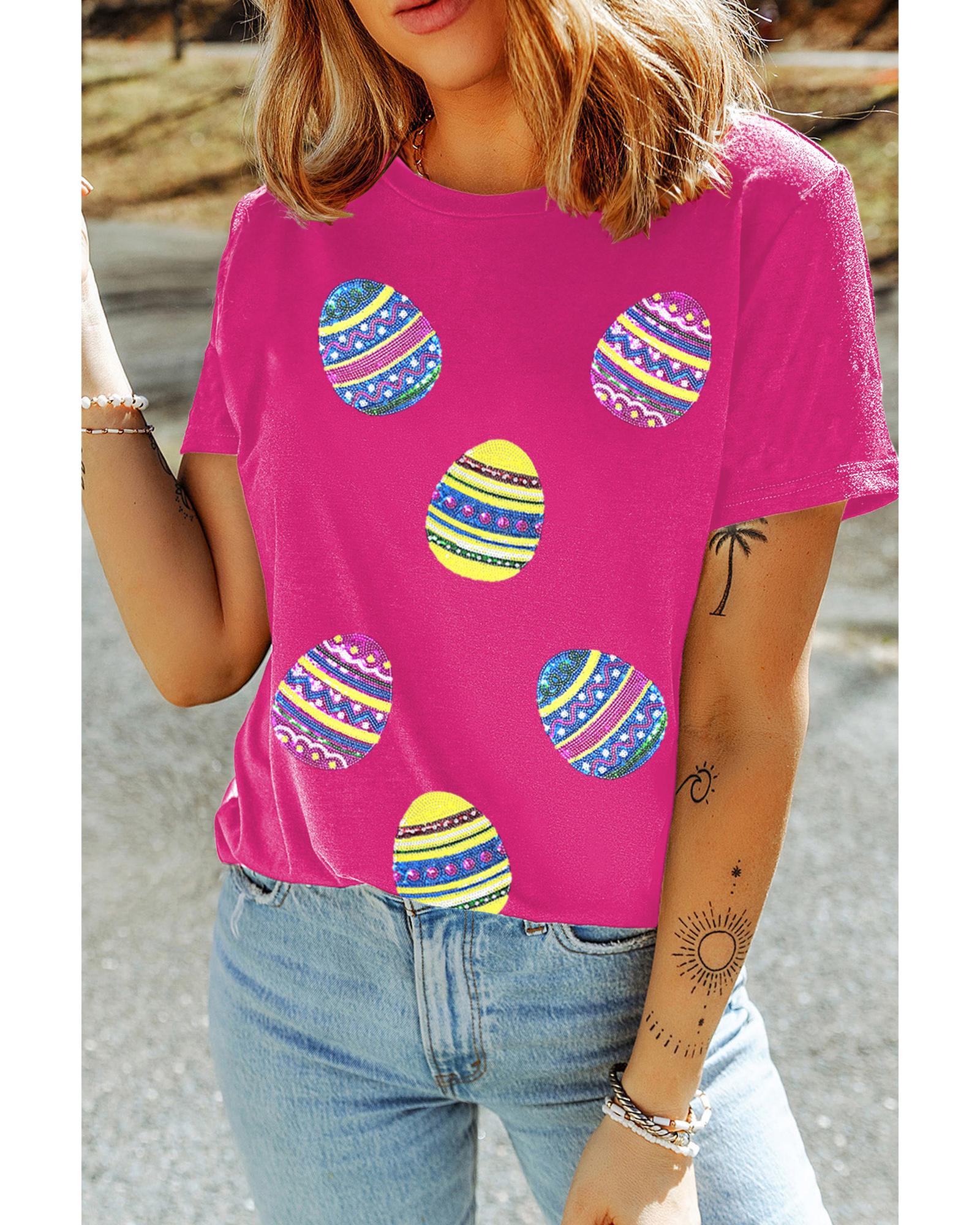 Rose Red Sequin Easter Egg Graphic Casual T Shirt – M