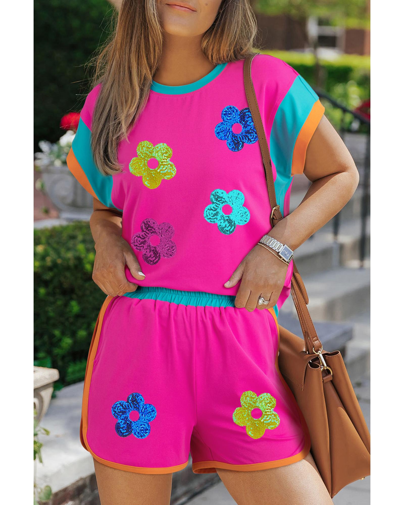 This two-piece shorts set features a vibrant flower graphic embellished with shimmering sequins, combining a stylish design with comfortable wear. It is suitable for lounging or running errands, offering a trendy and casual look.