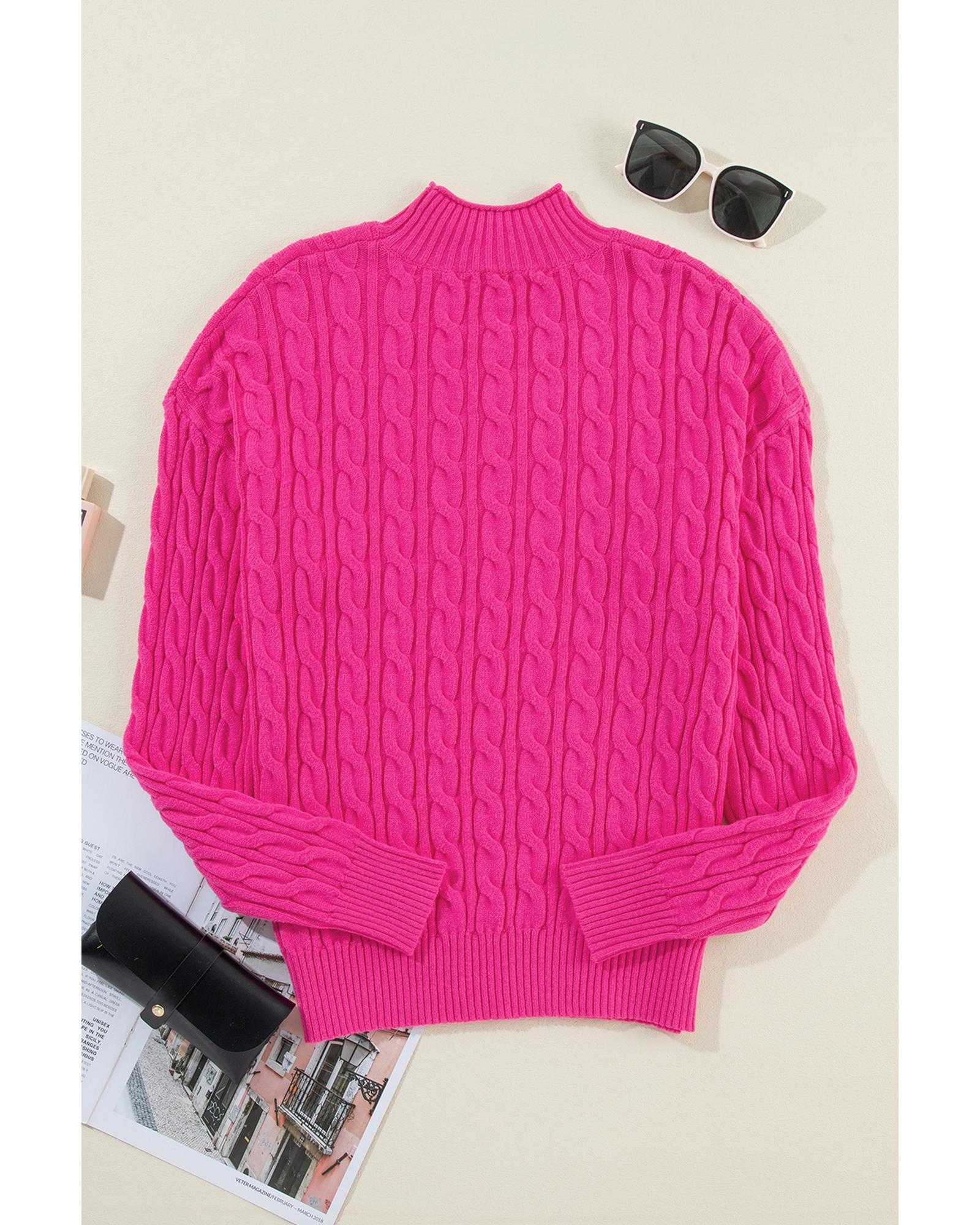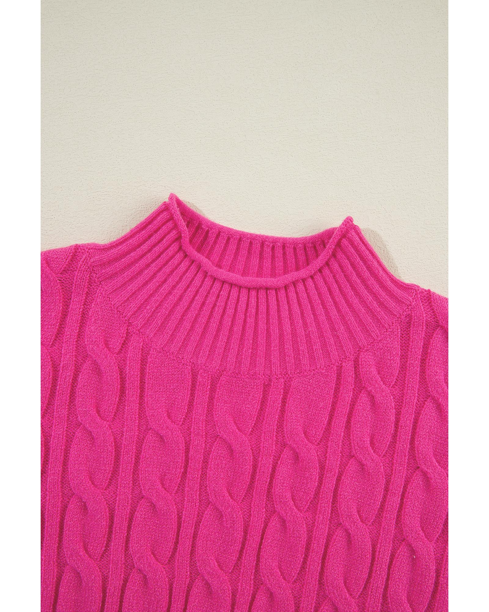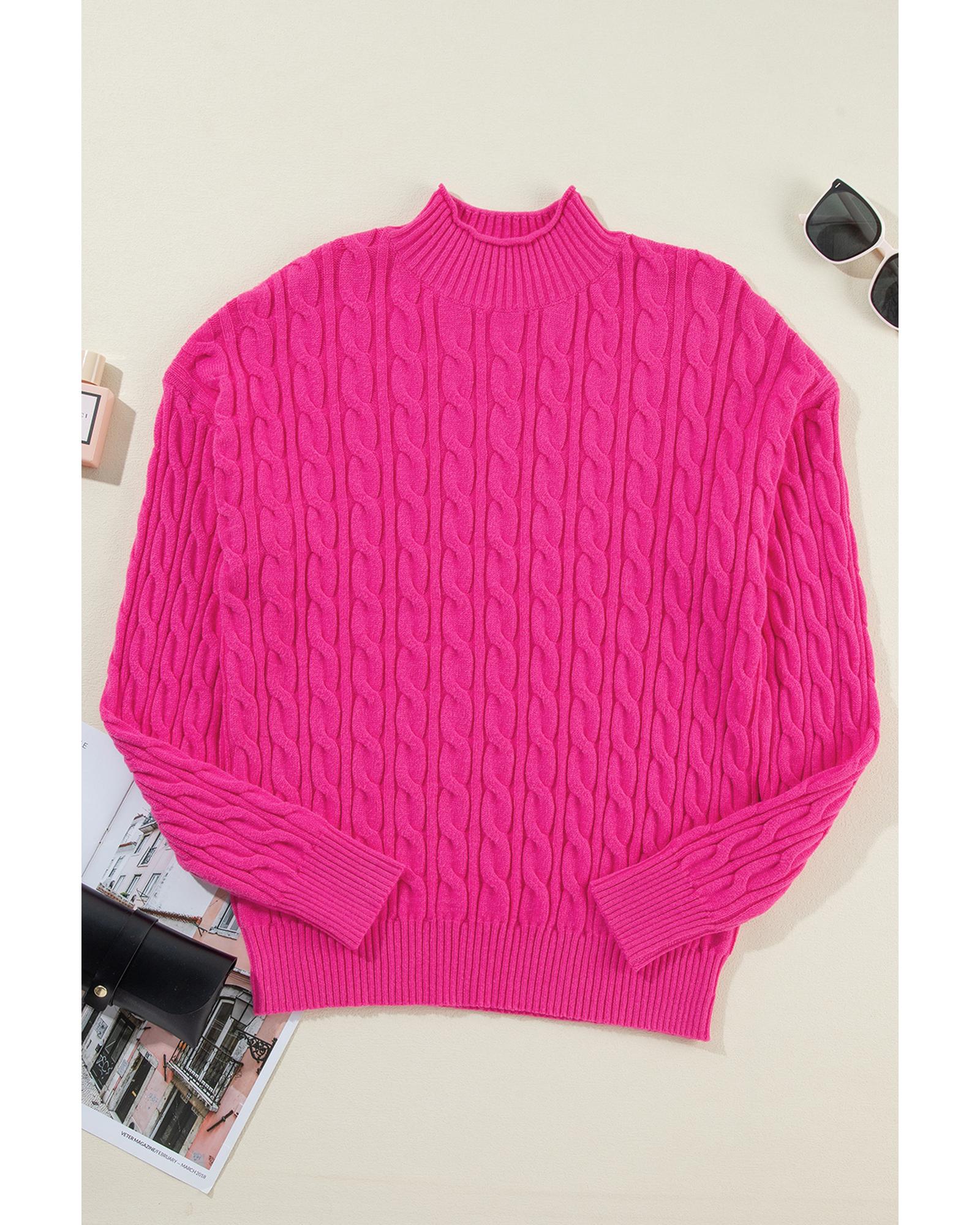 Rose Red Solid Cable Knit High Neck Drop Shoulder Sweater – S