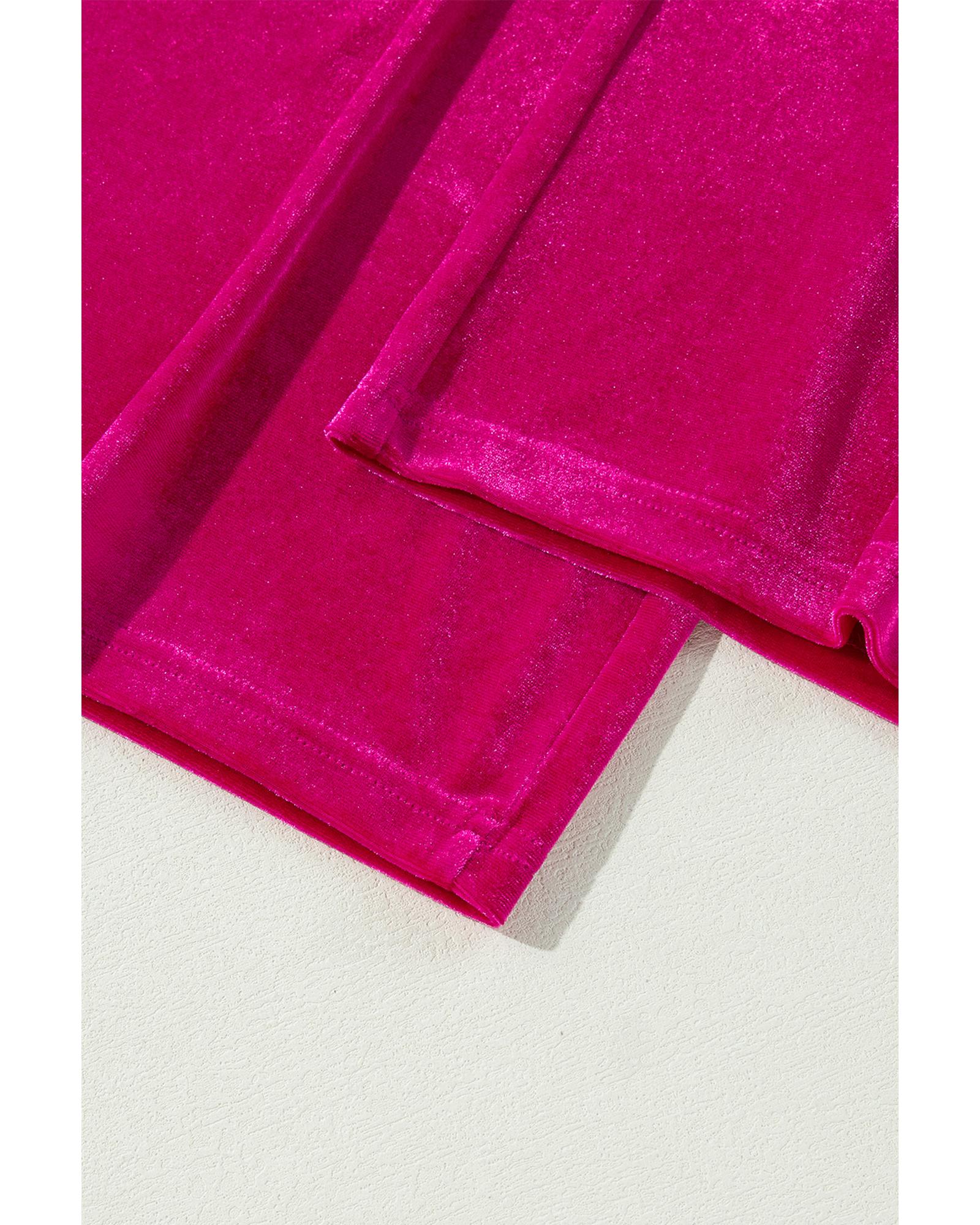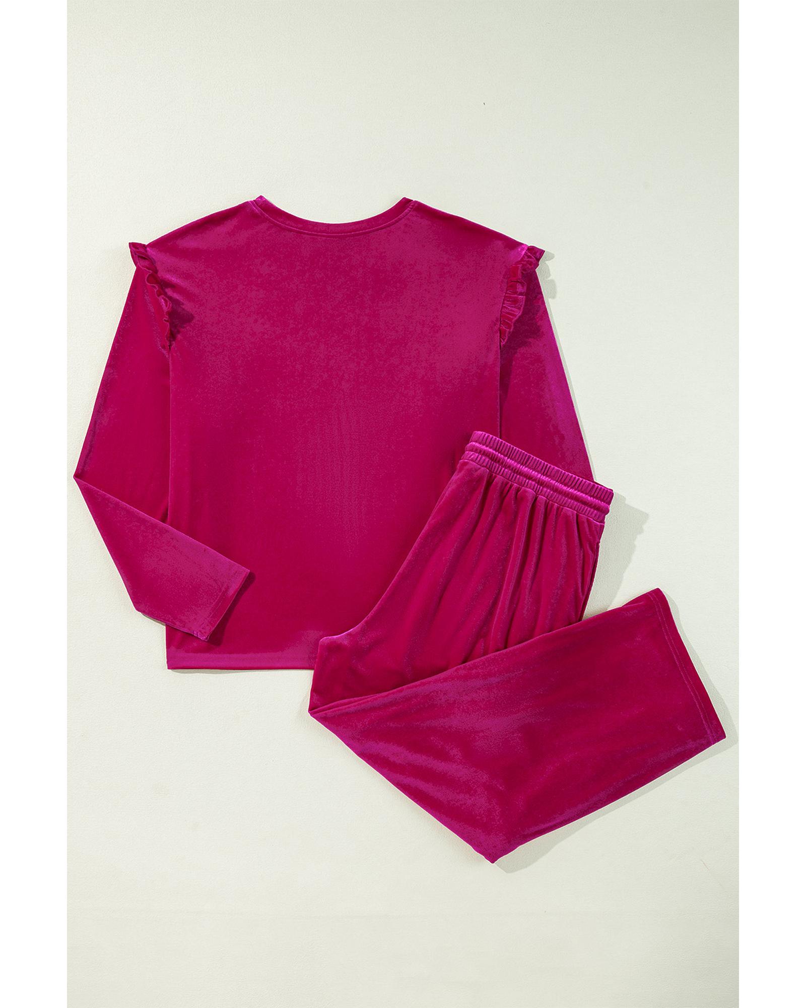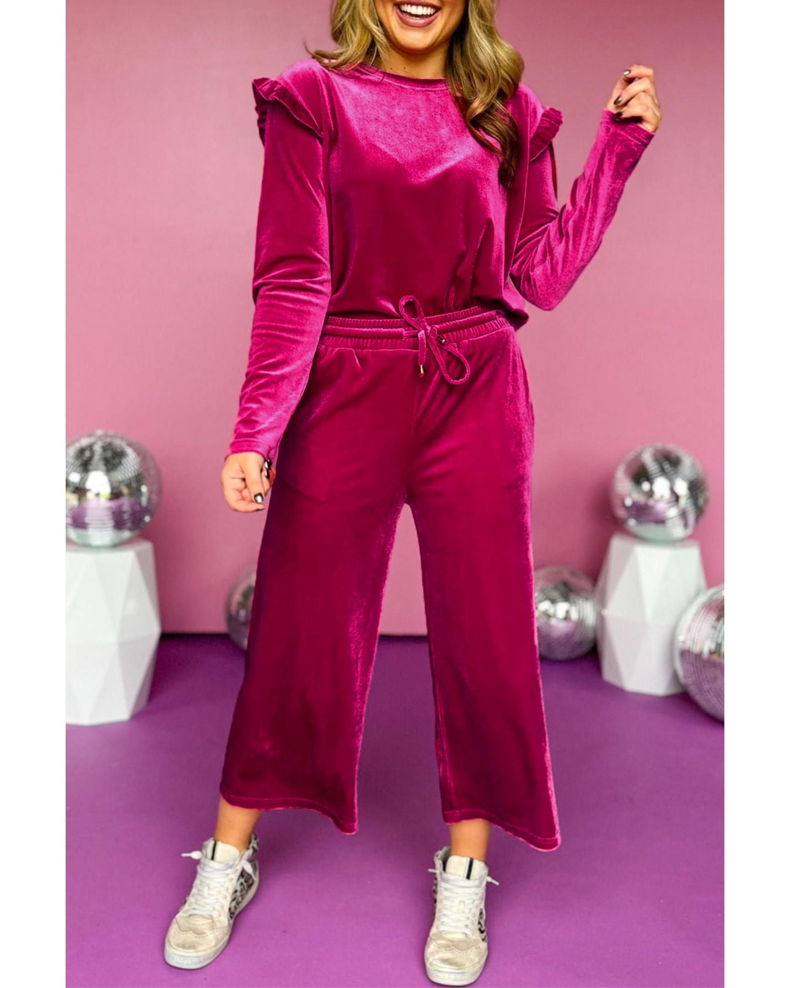 Rose Red Solid Velvet Ruffled Two Piece Pants Set – M