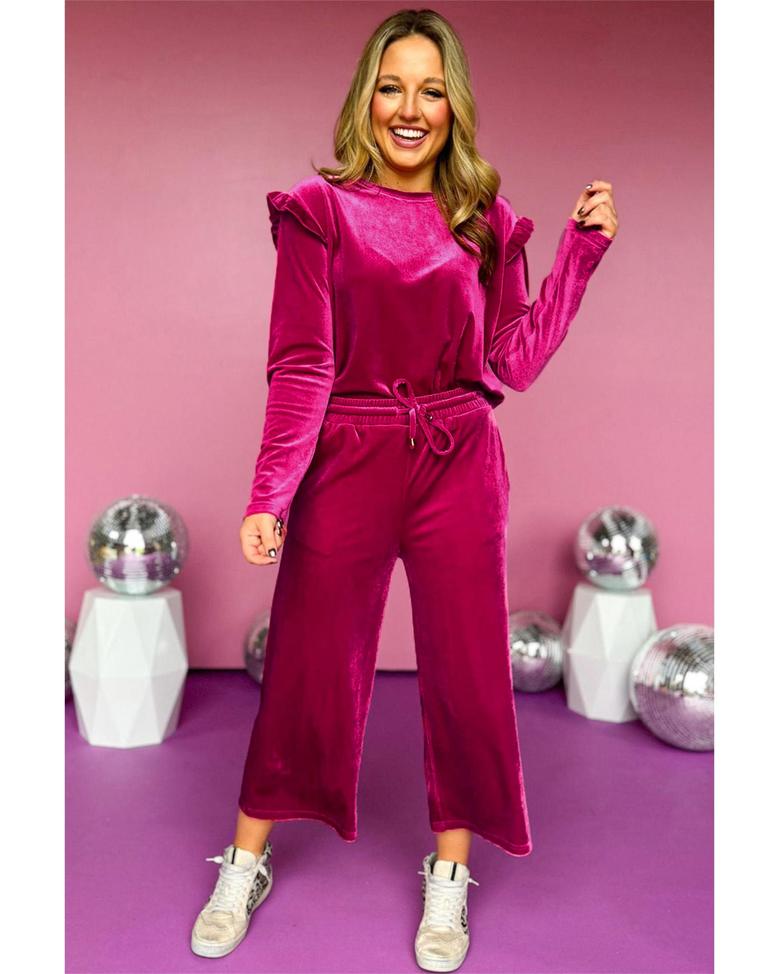 This two-piece pants set features a solid velvet fabric in a vibrant rose red color, combining a ruffled long sleeve top with cropped pants. Designed for both dressy and casual occasions, it offers a trendy fitted look with high elasticity for added comfort and style.