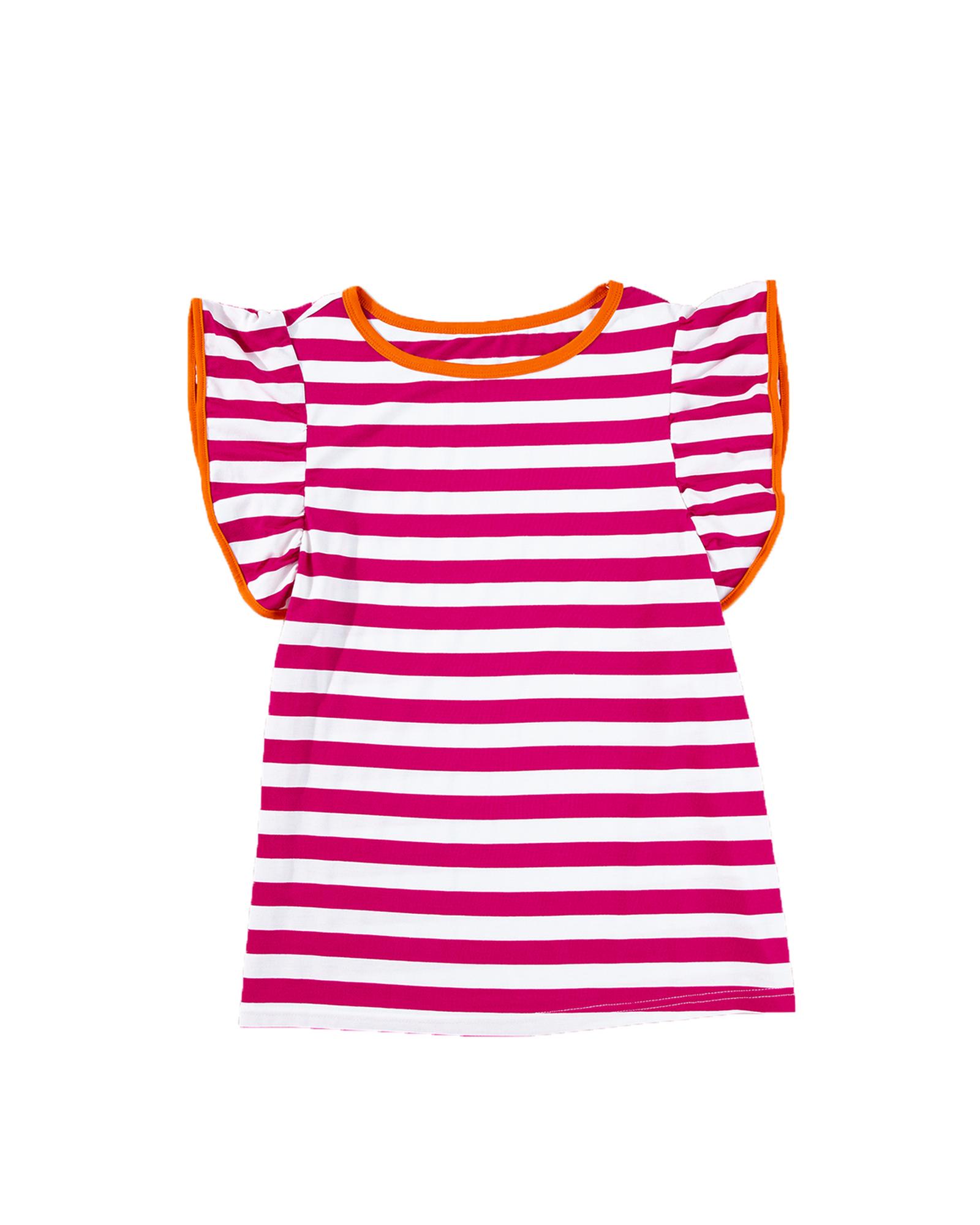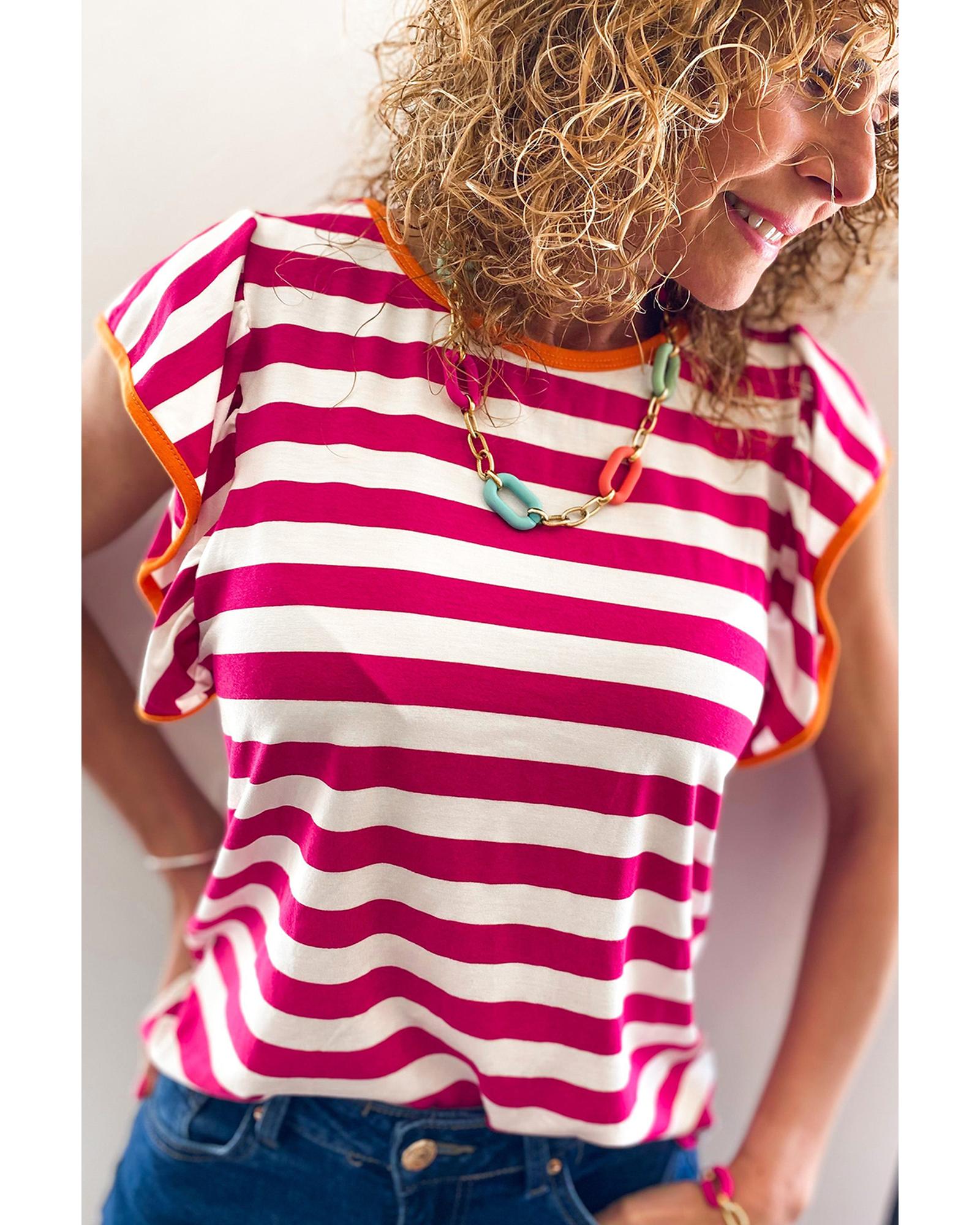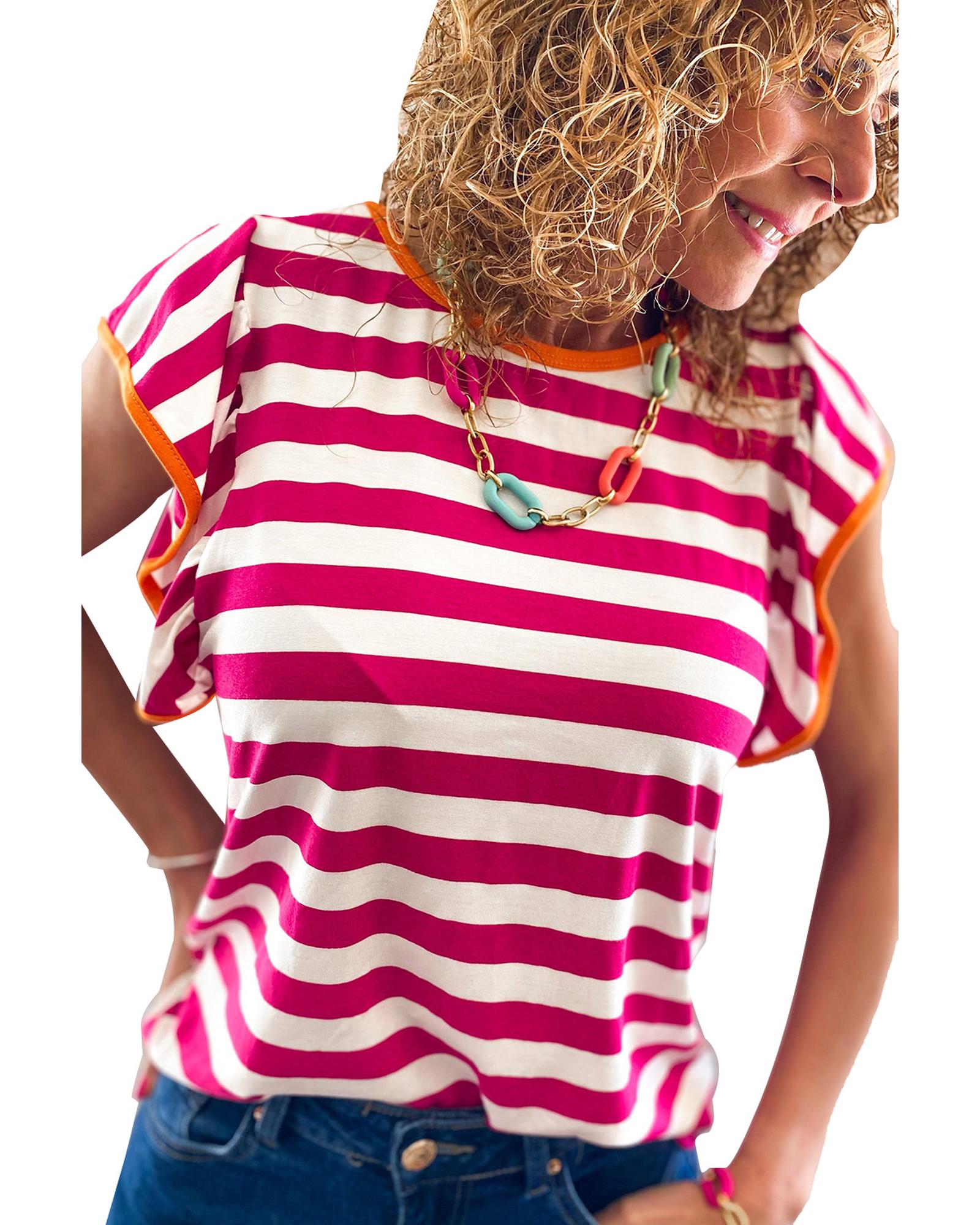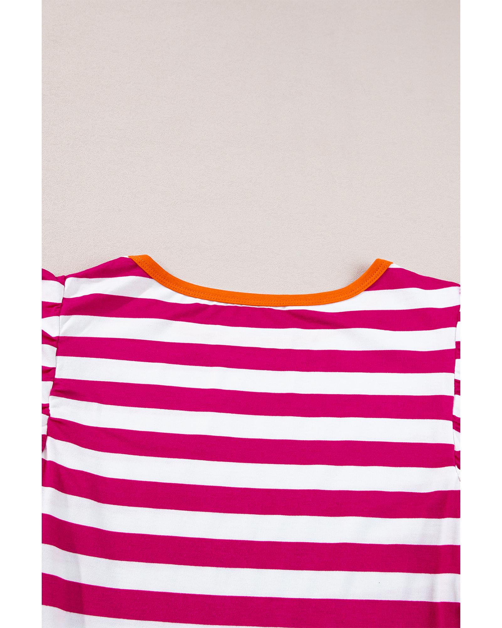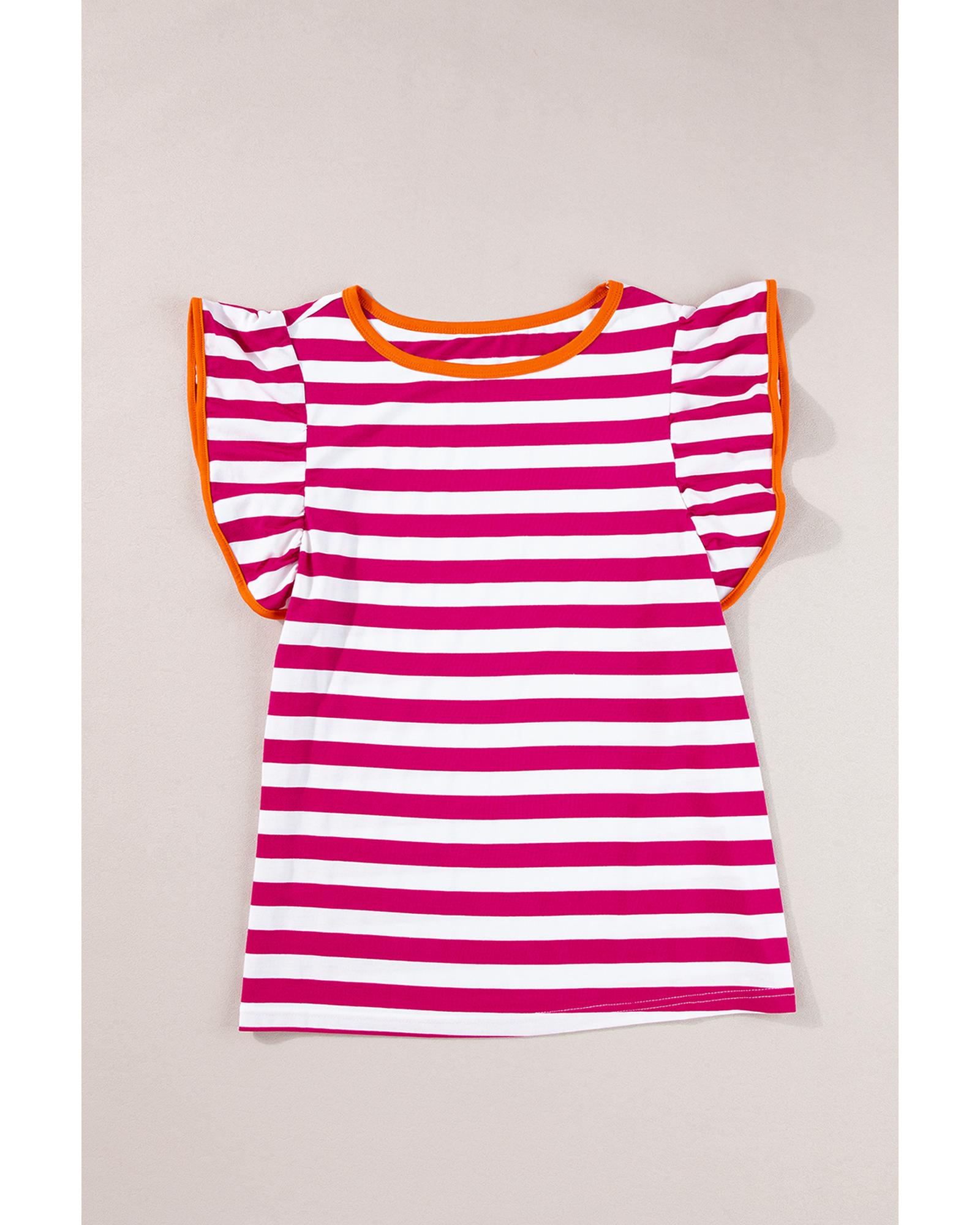 Rose Red Striped Ruffle Sleeve Crew Neck Blouse – M