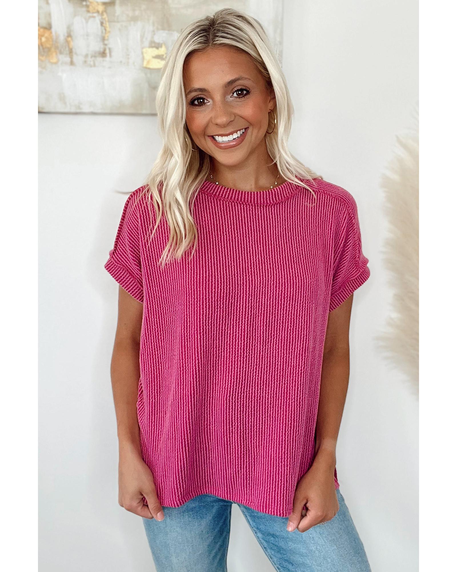 Rose Red Textured Knit Exposed Stitching T-shirt – L