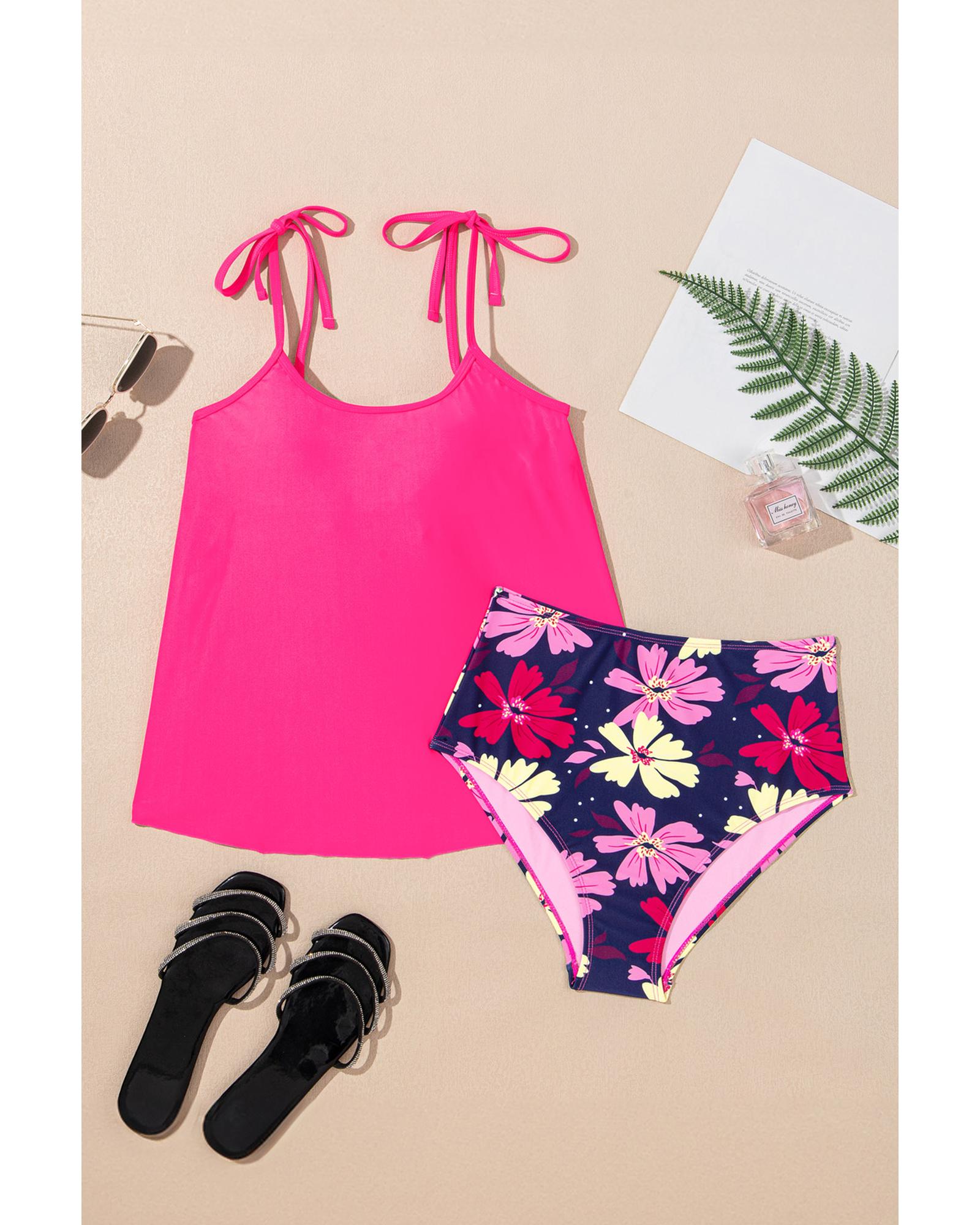 This floral print tankini set features a vibrant design with playful details, making it an ideal choice for beach or poolside activities. The adjustable tie shoulder straps allow for a customized fit, while the flattering tankini cut offers comfort and coverage for a relaxed swimwear experience.
