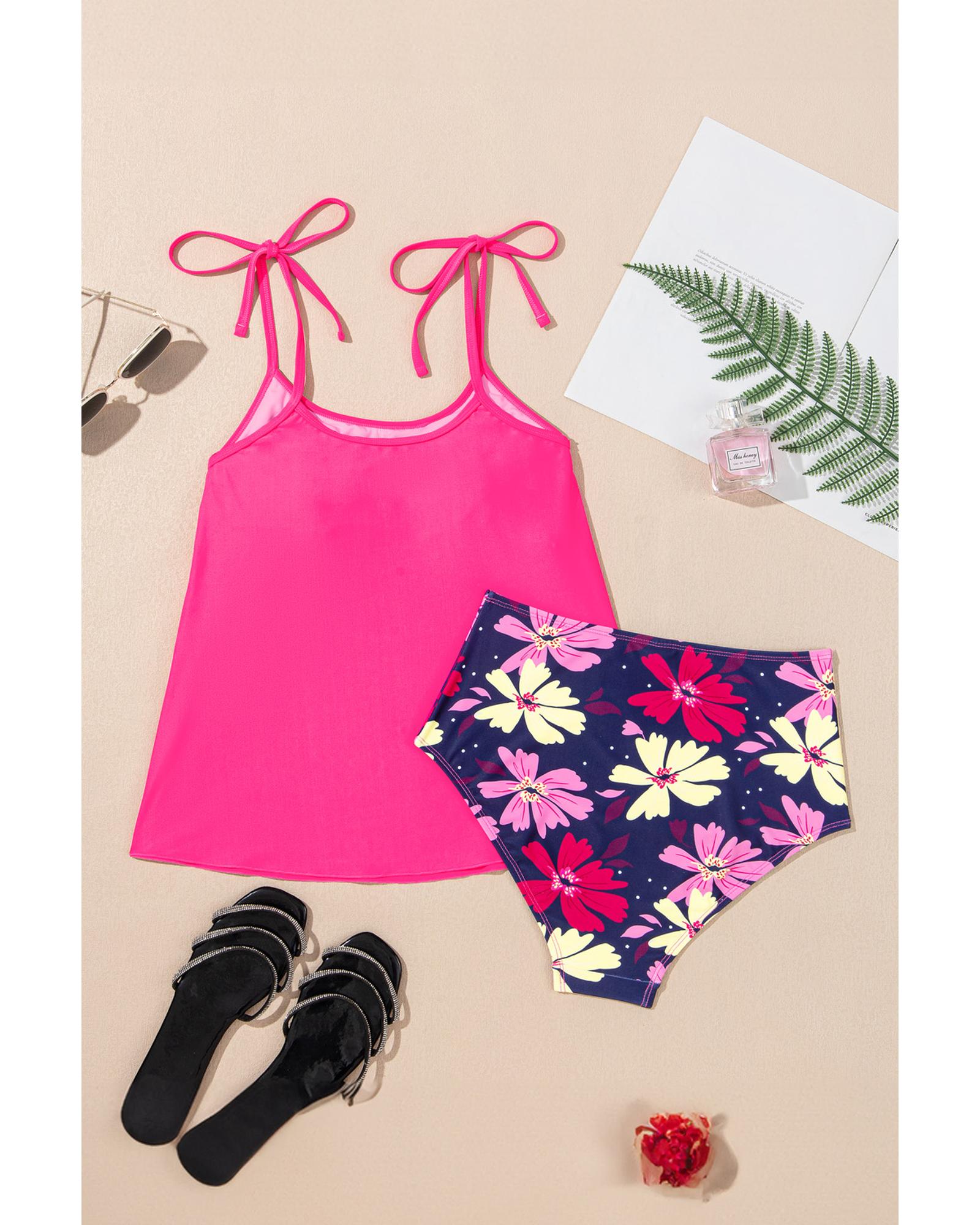 This floral print tankini set features a vibrant design with playful details, making it an ideal choice for beach or poolside activities. The adjustable tie shoulder straps allow for a customized fit, while the flattering tankini cut provides comfort and coverage for a relaxed swimwear experience.