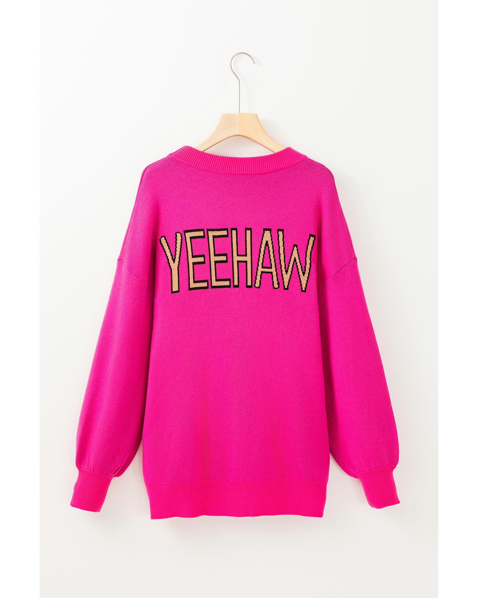 This oversized sweater features a vibrant rose red color and a fun Western cowboy hat graphic with the exclamation YEEHAW. Designed with a trendy drop shoulder and oversized fit, it offers a casual and comfortable style suitable for layering and various body types.