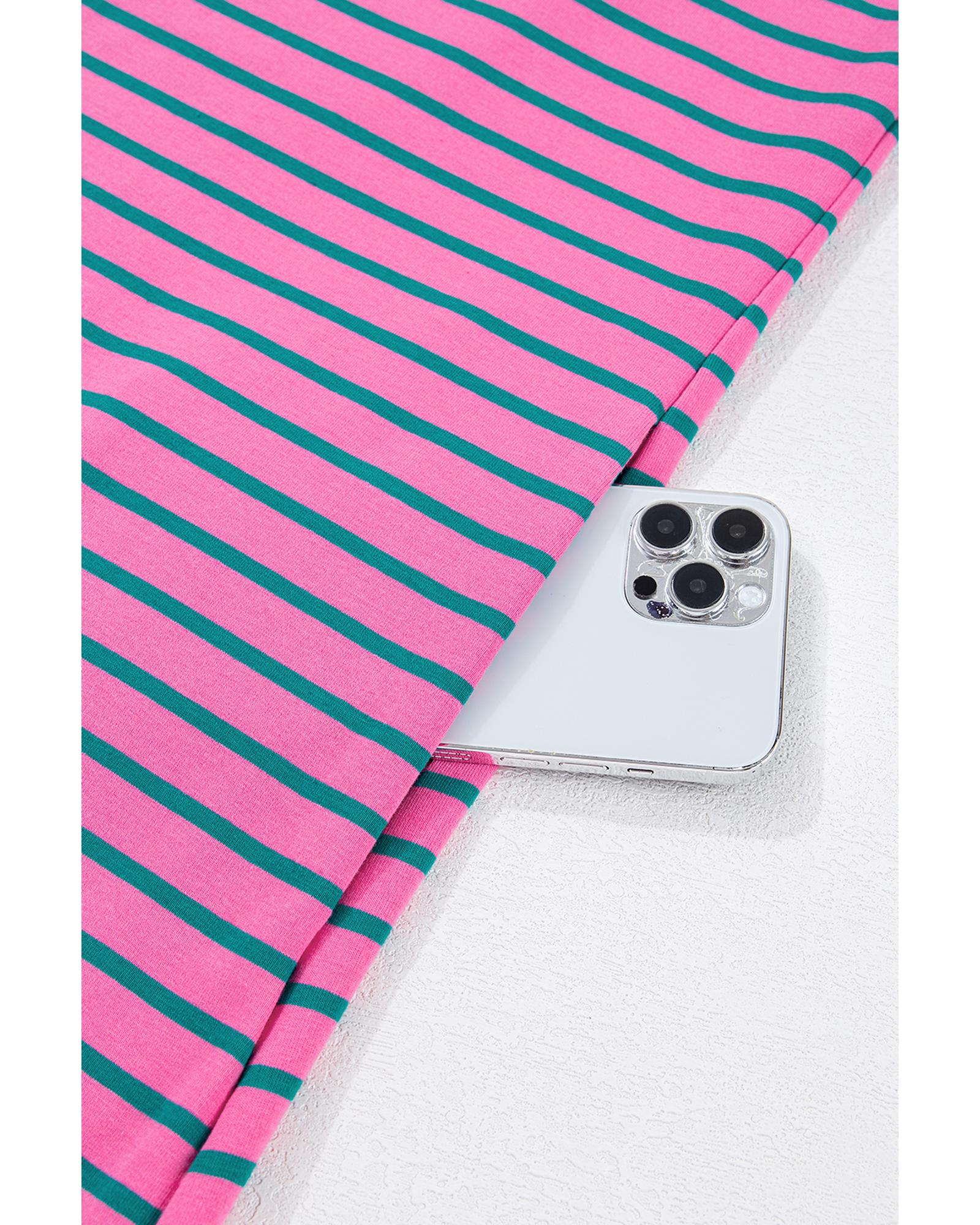 Rose Stripe Collared V Neck Puff Sleeve Shift T Shirt Dress with Pockets – 2X