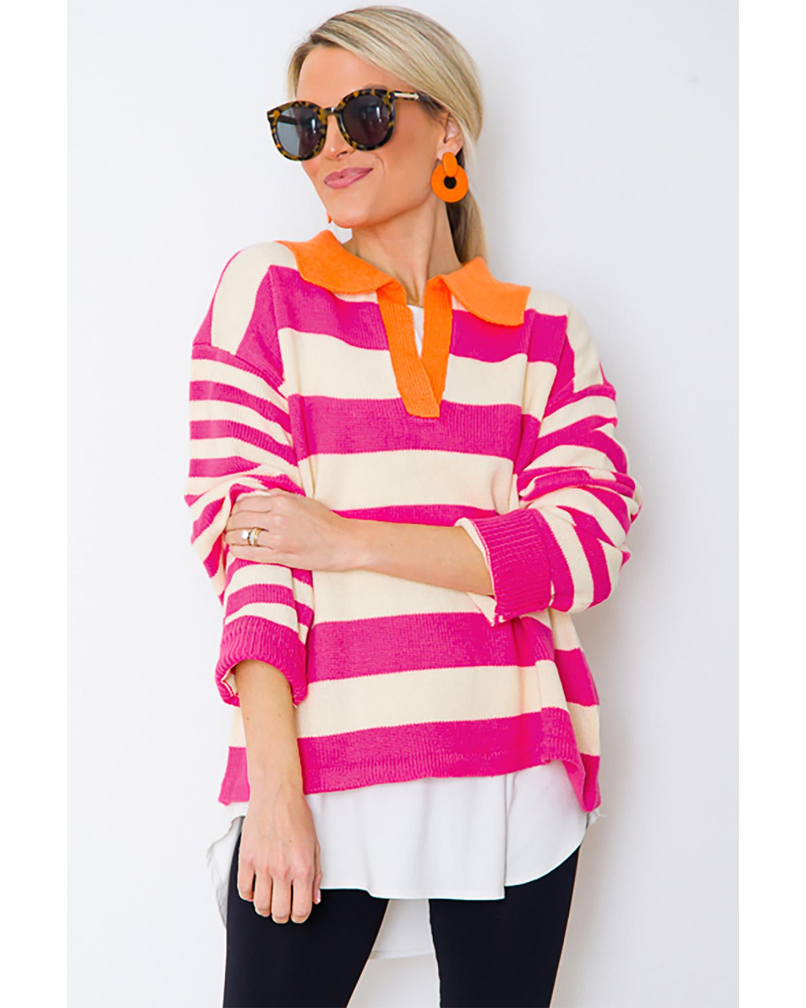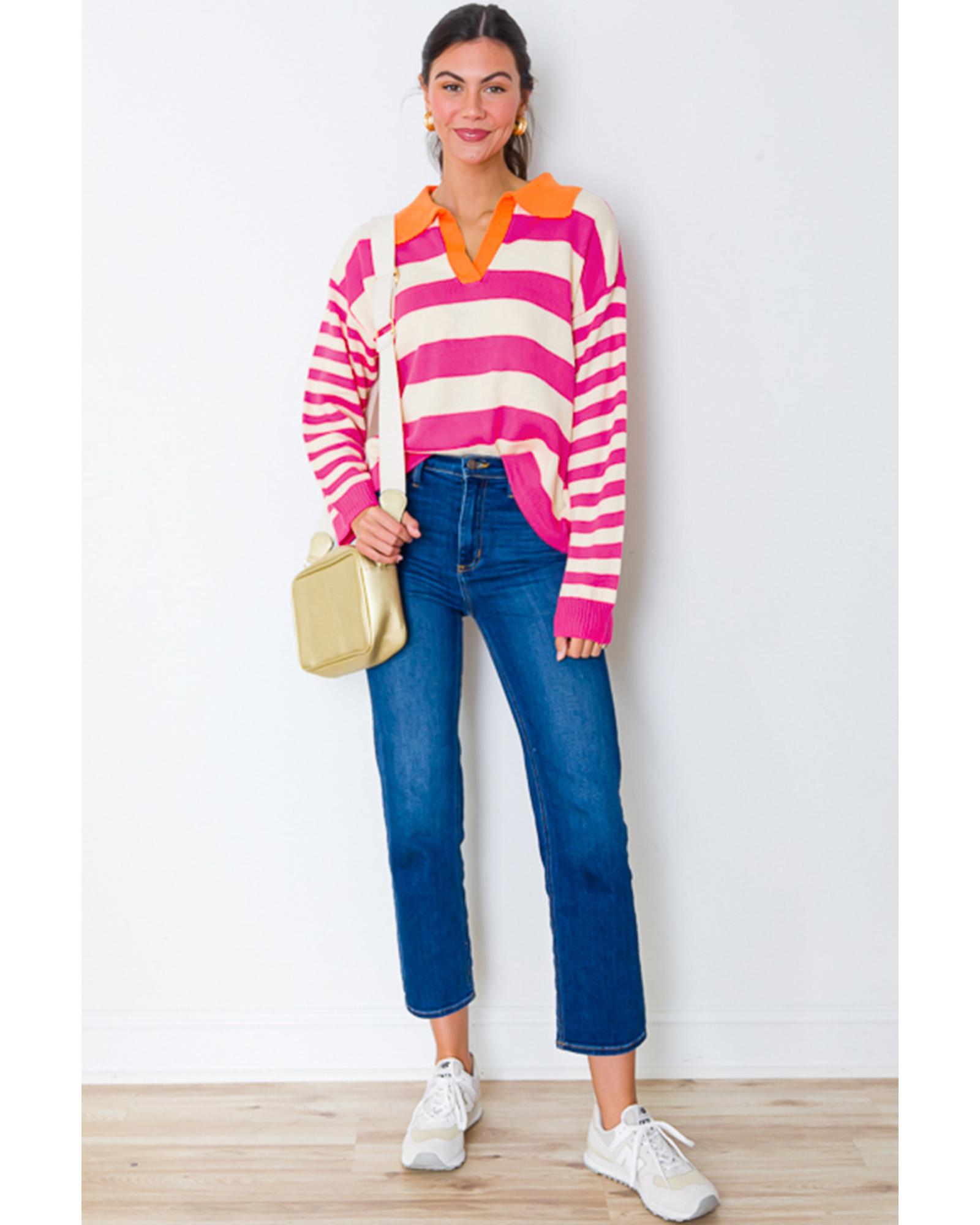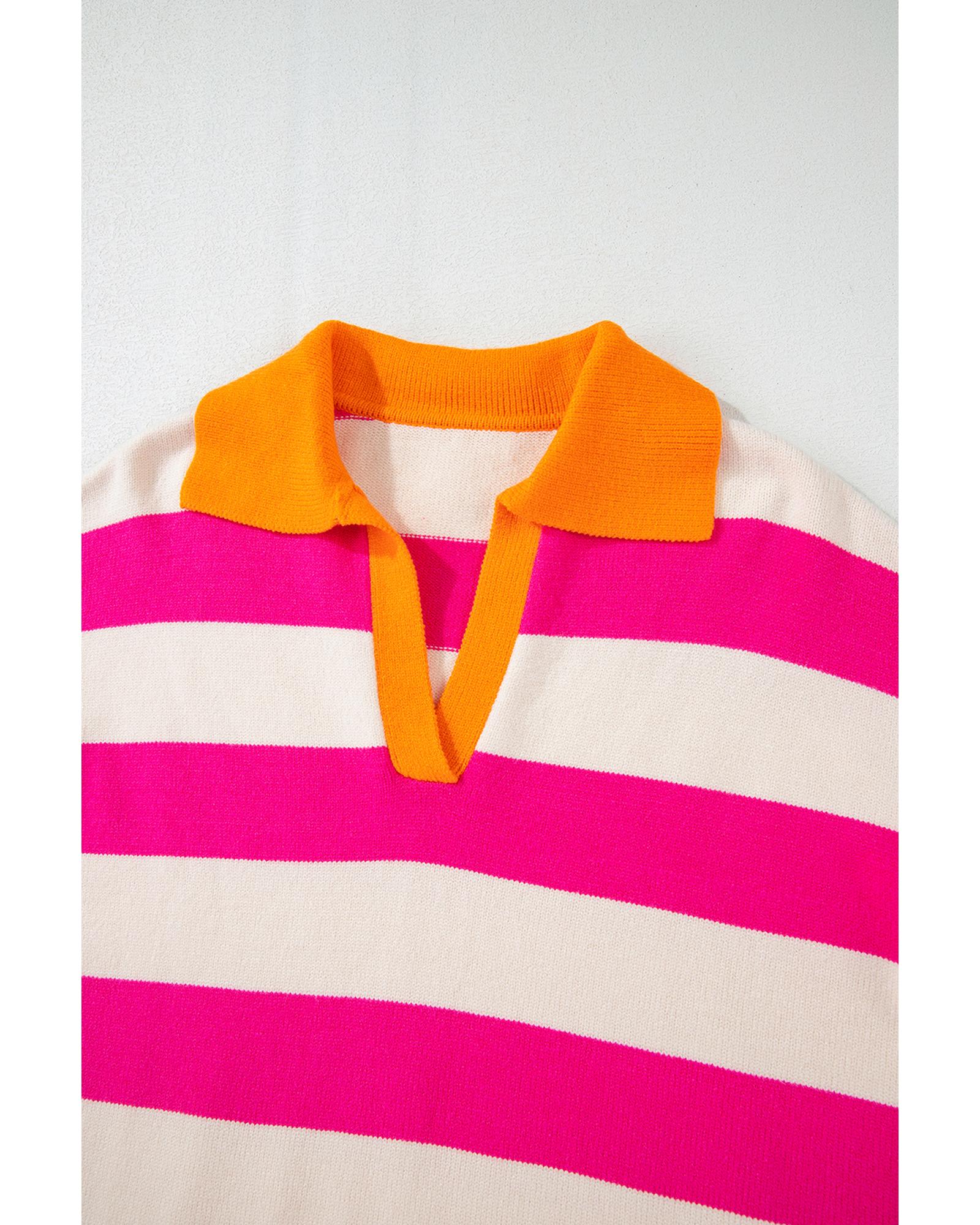 Rose Stripe Color Block Collared V Neck Drop Shoulder Sweater – S