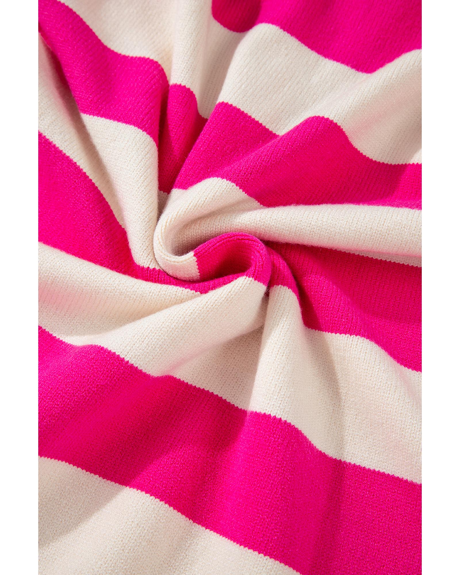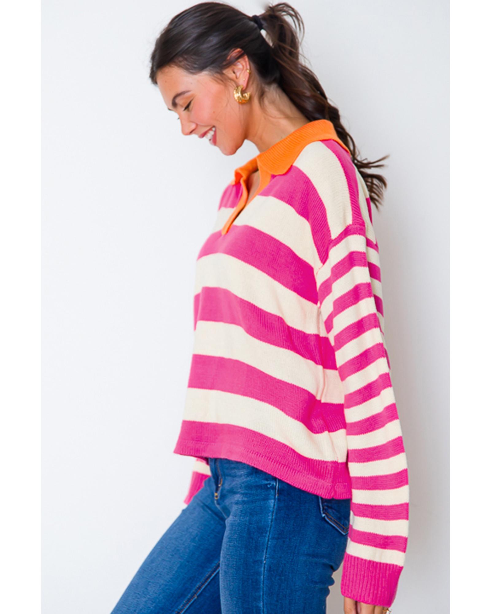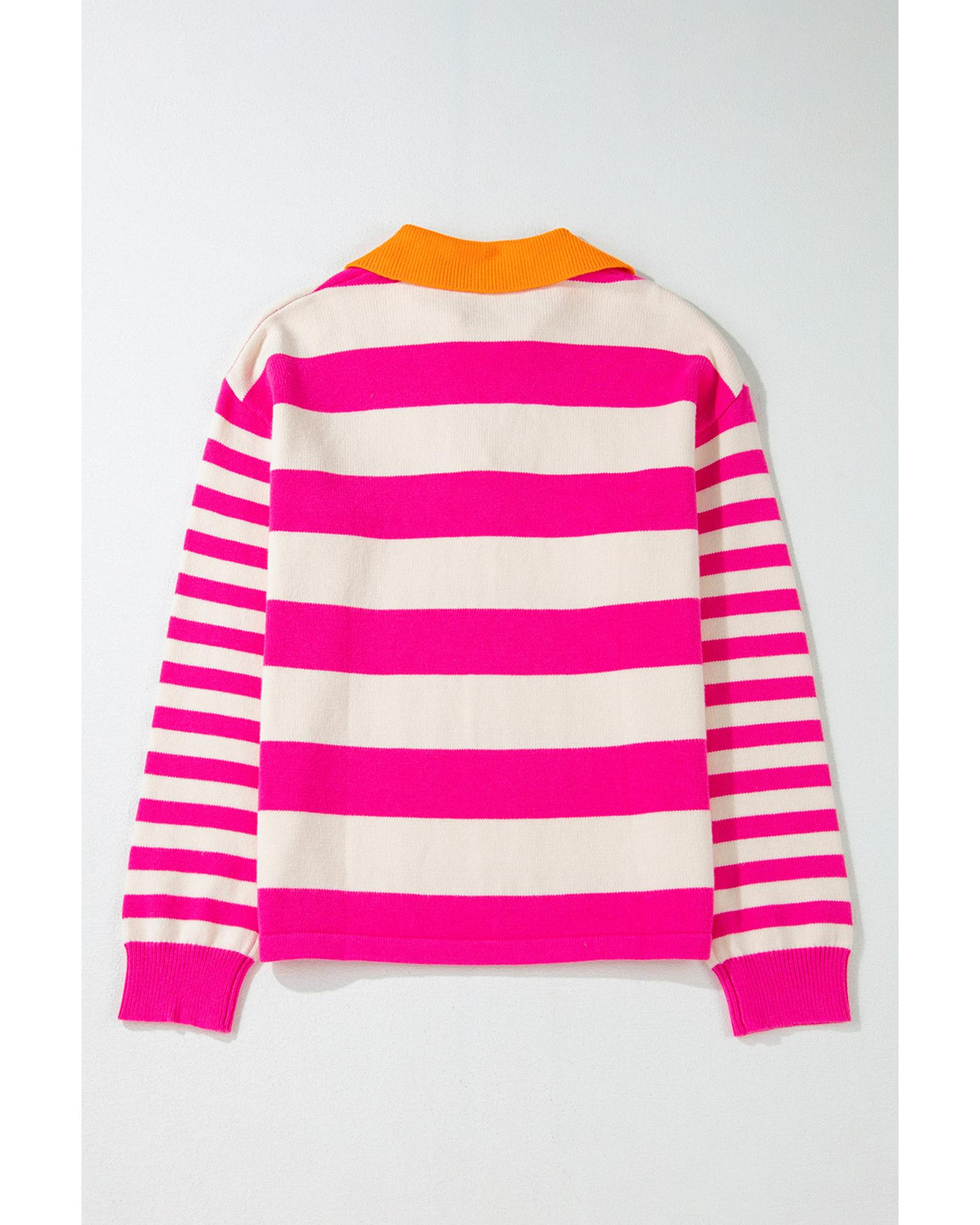 Rose Stripe Color Block Collared V Neck Drop Shoulder Sweater – S