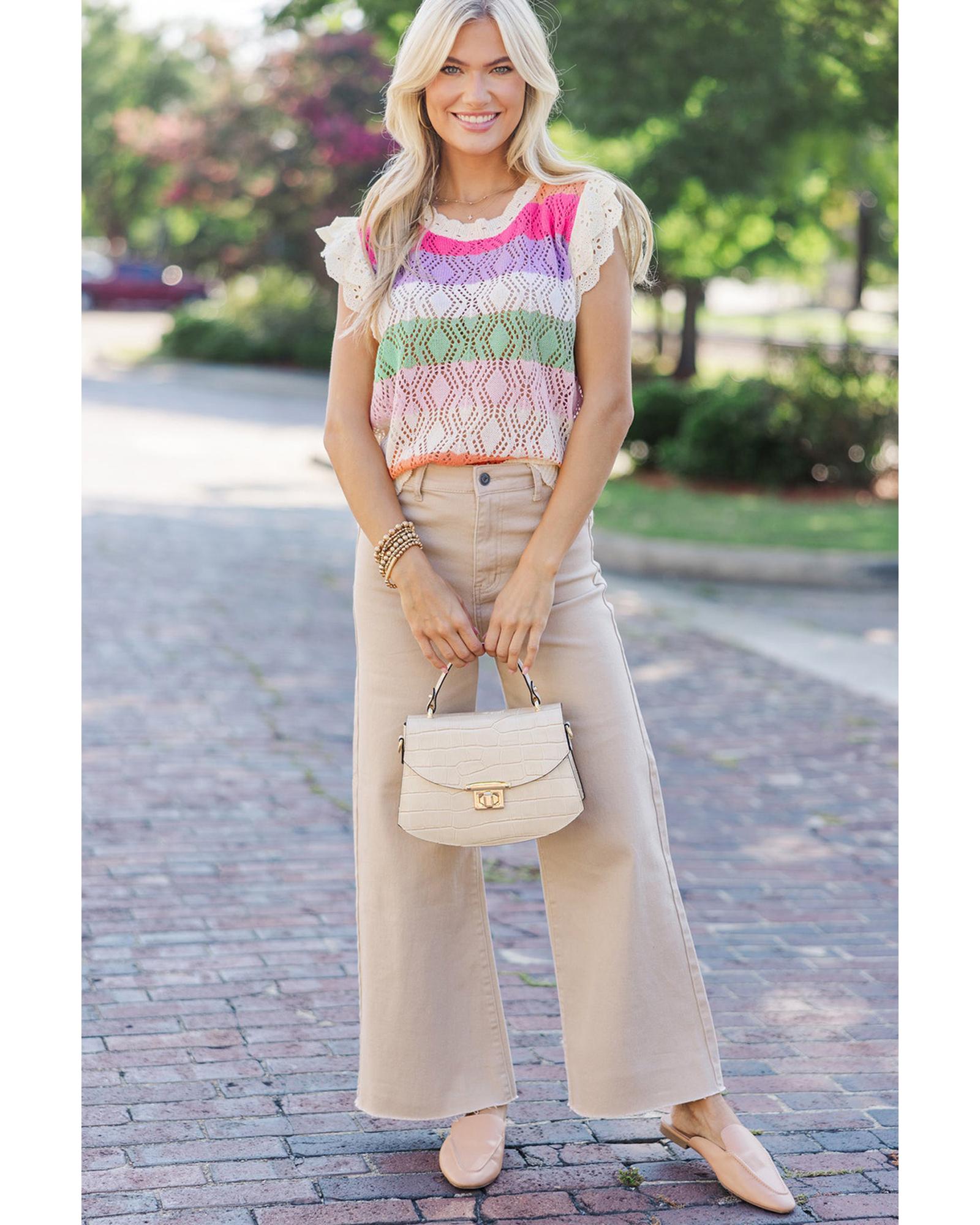 This sweater vest features a stylish colorblock design with multicolor stripes and a trendy hollowed knit pattern. The scallop edge detail adds a touch of elegance, making it suitable for layering or wearing alone for a fashionable look.
