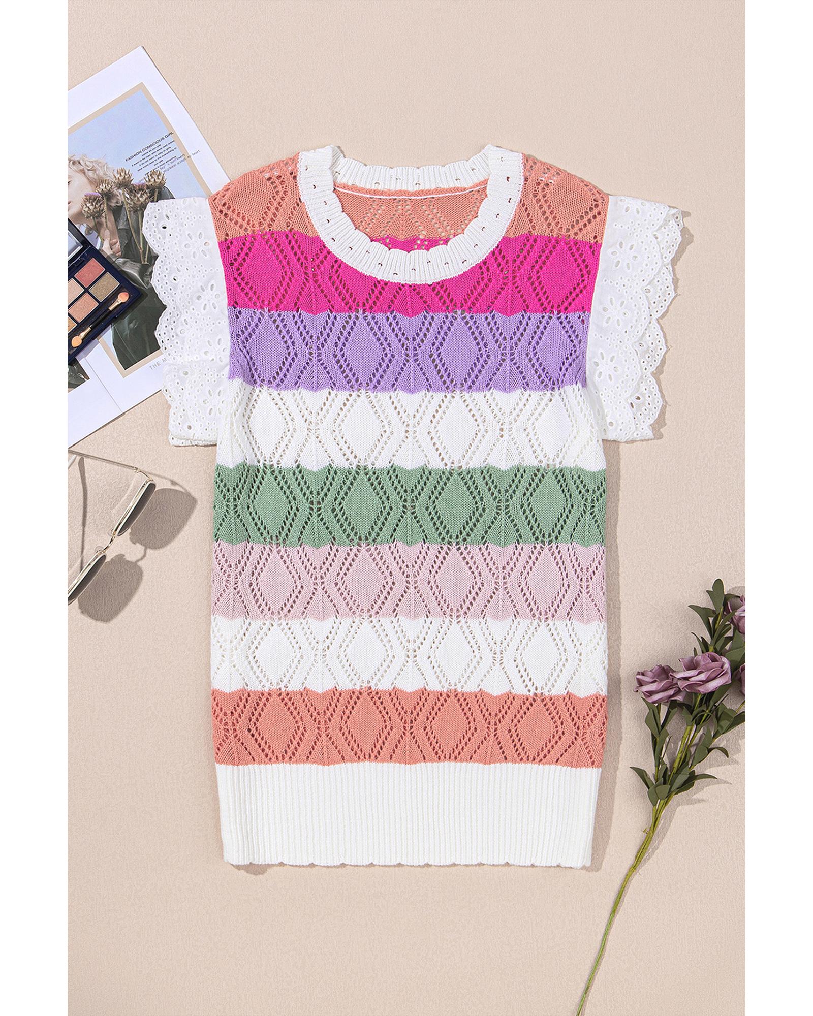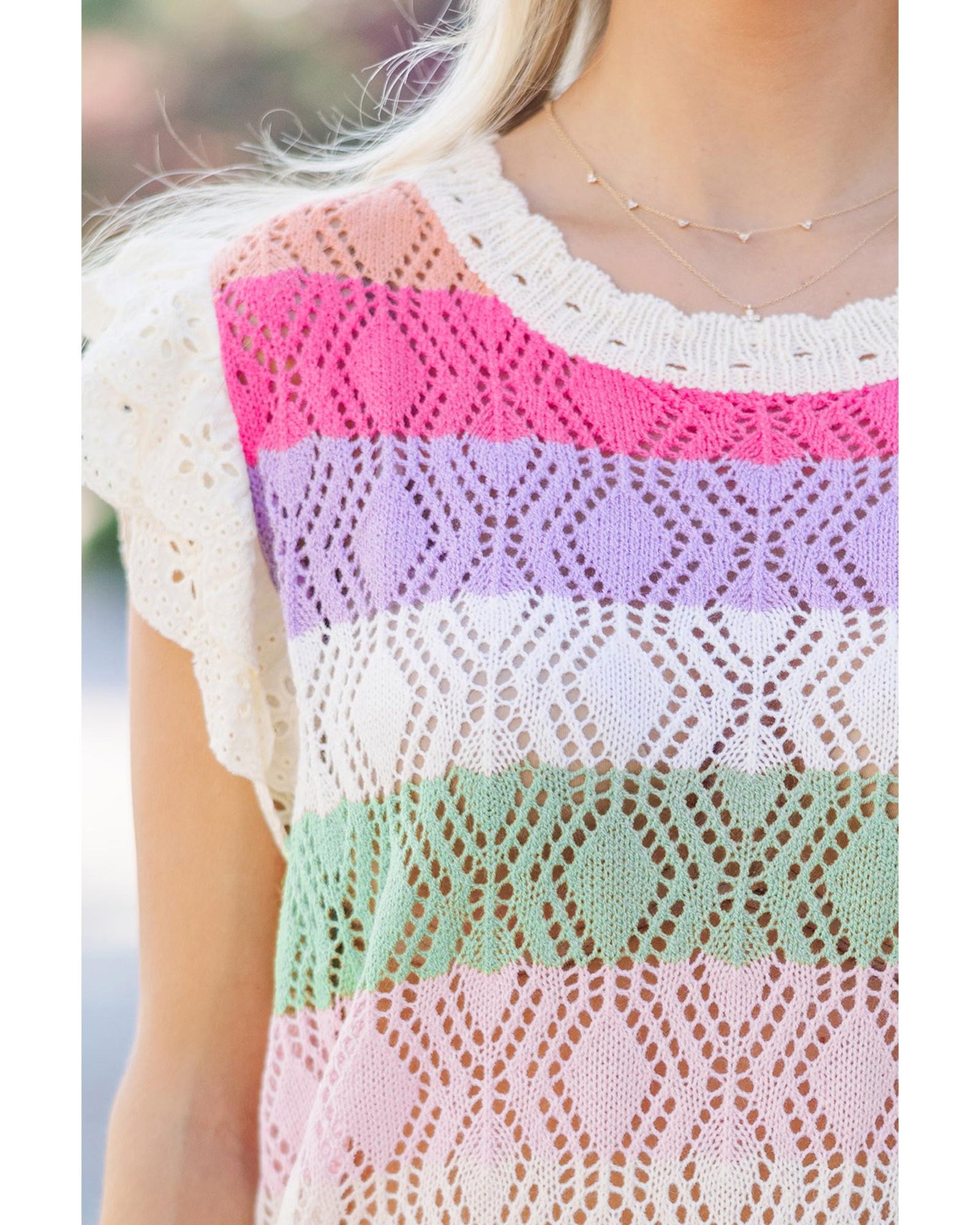 Rose Stripe Colorblock Hollowed Knit Scallop Edge Sweater Vest – M