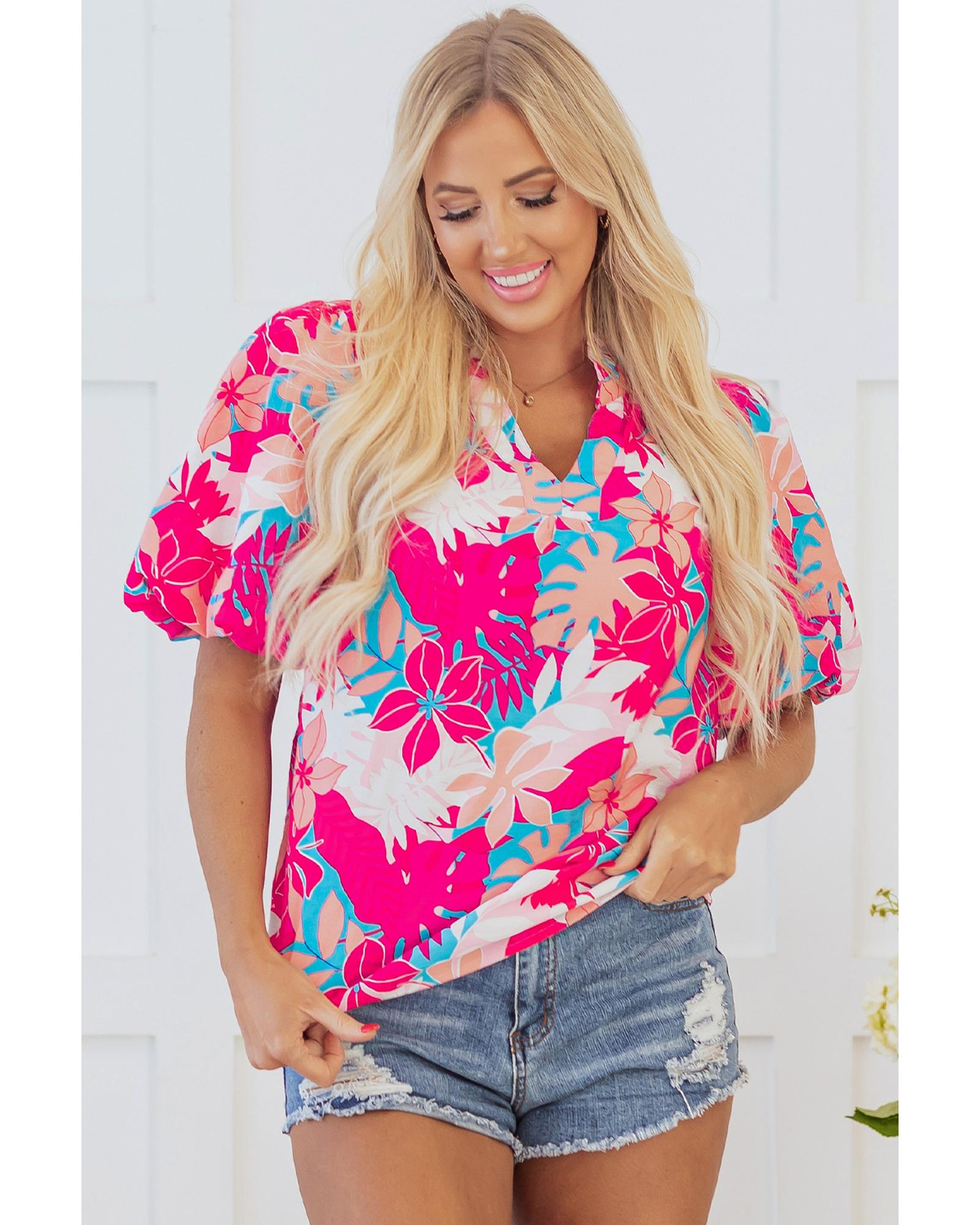 Rose Tropical Plant Printed V Neck Puff Sleeve Blouse – XL
