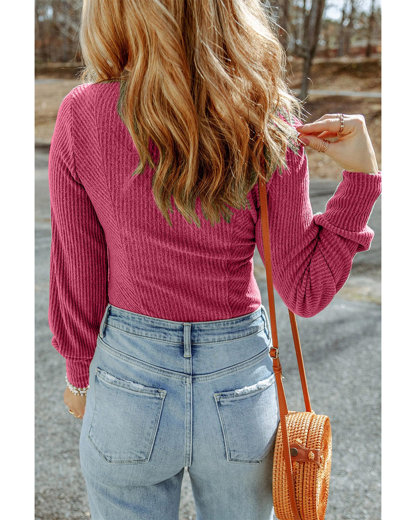This textured long sleeve top features a stylish U neckline and a unique textured design, making it suitable for both casual and dressy occasions. Designed with a fitted silhouette, it offers a versatile and trendy look for women.