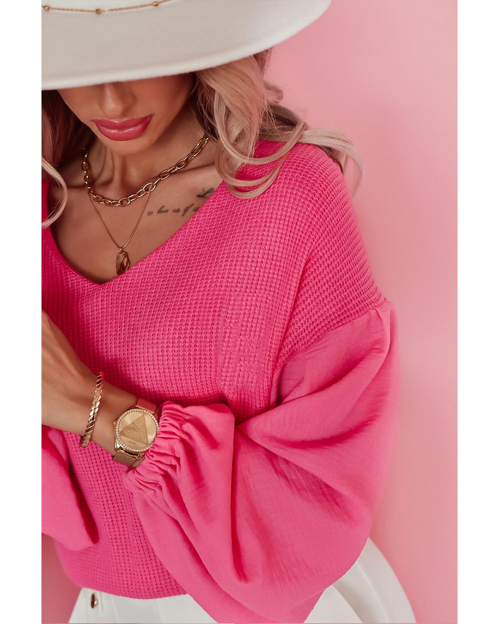 Rose Waffle Knit Balloon Sleeve Splicing V Neck Top – XL