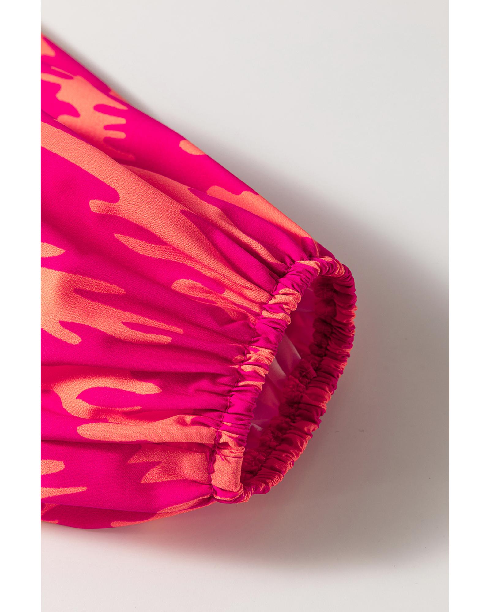 This stylish two-piece set features a trendy fitted design with an Aztec geometric print, perfect for a fashionable and playful look. The set includes a top with bubble sleeves and ruffled accents, paired with matching shorts that have delicate ruffled details. The design incorporates a chic V-neck and drop shoulder style, offering a feminine and modern appearance.
