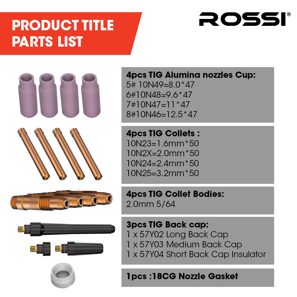 ROSSI 16pc Welding Consumables Kit to Suit 17/18/26 TIG Torch, Includes Alumina Nozzle Cups, Collets