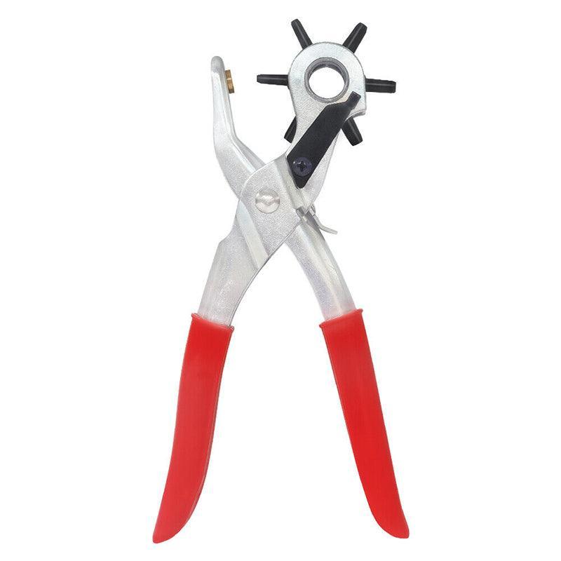 This rotating leather hole punch plier is designed for precise and effortless punching on various materials such as leather, plastic, and paper. It features six rotating punch heads that allow easy switching between different sizes to suit different crafting and repair needs. The tool is constructed with durable materials and ergonomic handles for comfort and long-lasting use.