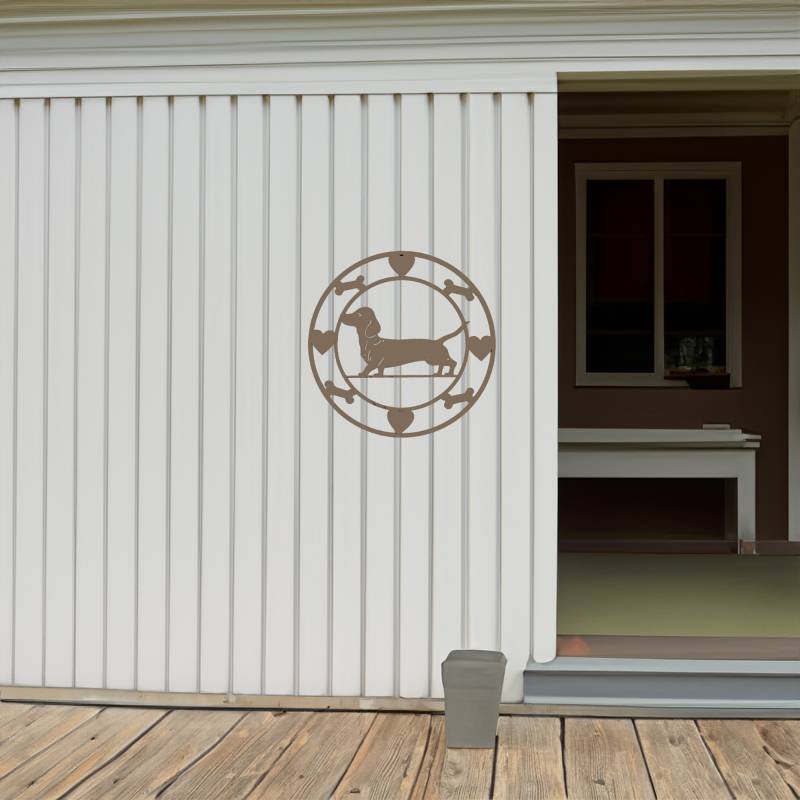 This round dachshund metal wall art adds a stylish and decorative touch to any space. Its sleek design and modern aesthetic make it a versatile piece for various interior styles.