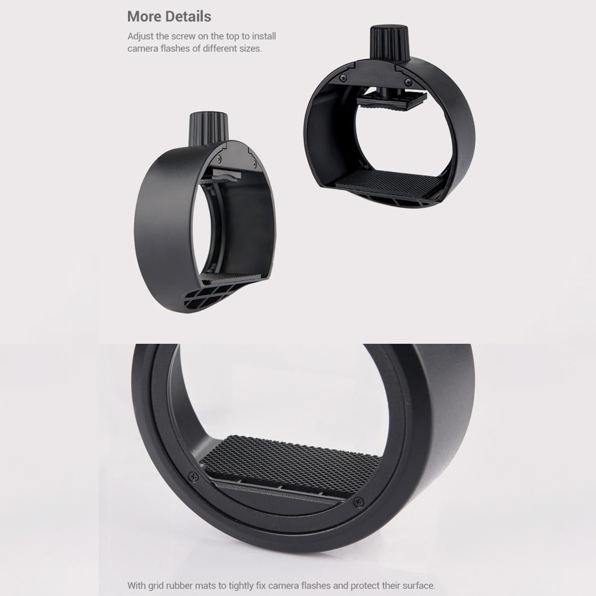 This round flash adapter is designed to fit various camera flashes, providing a secure and protective connection. It is suitable for use with multiple brands and models, ensuring versatility and convenience for photographers.