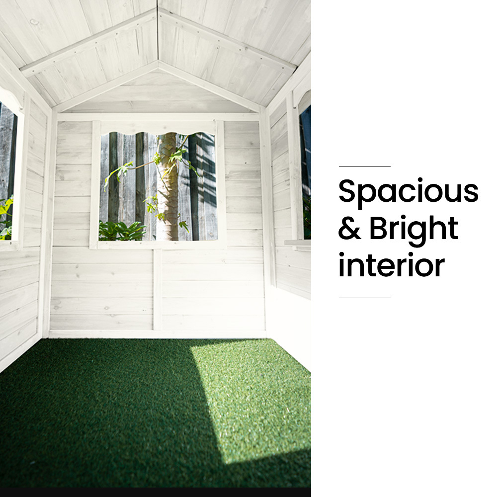 This wooden outdoor playhouse is designed for children to enjoy imaginative play in a safe and weather-resistant environment. Its cottage style features large windows and an accessible front door, providing a bright and open space for kids to explore and have fun outdoors. The construction emphasizes safety with rounded corners and non-toxic paint, making it suitable for children aged 3 and above.