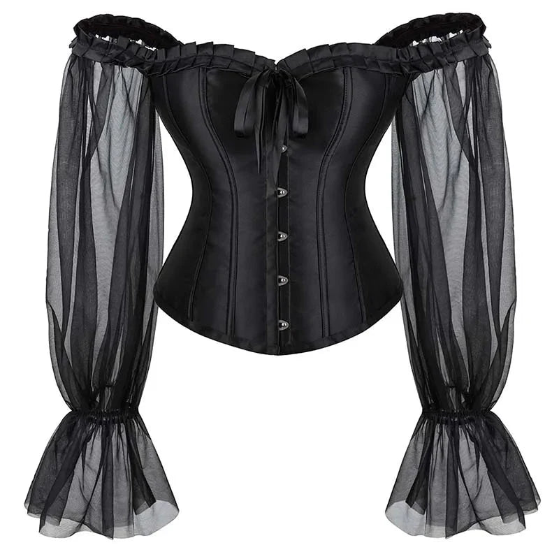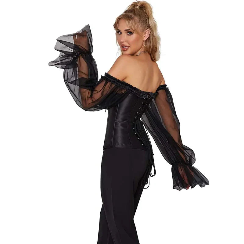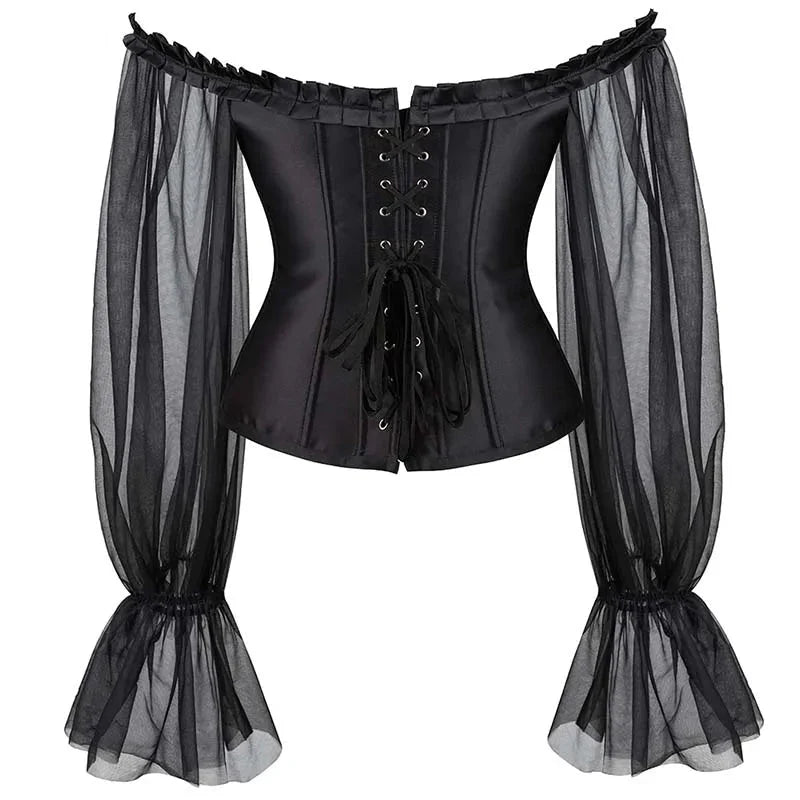 - 1 x Ruffled Gothic Corselet Top with Puff Sleeves and Lace-Up Boning Transparent Satin Overbust Corset