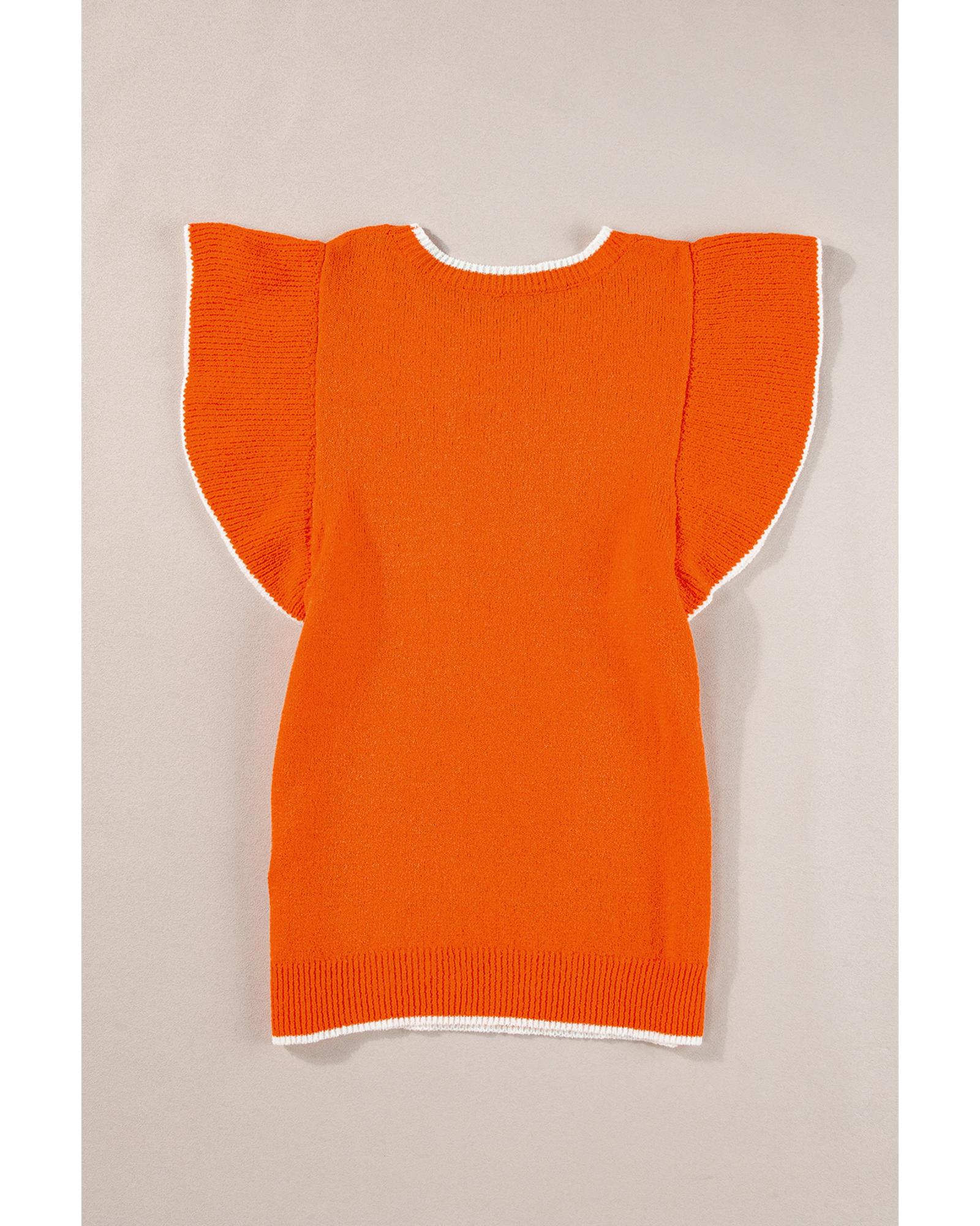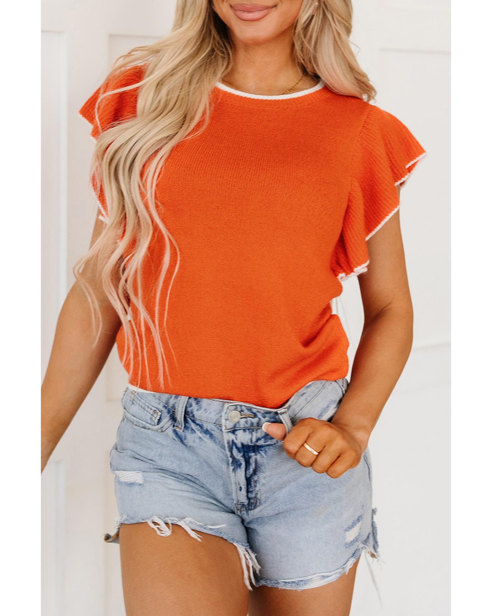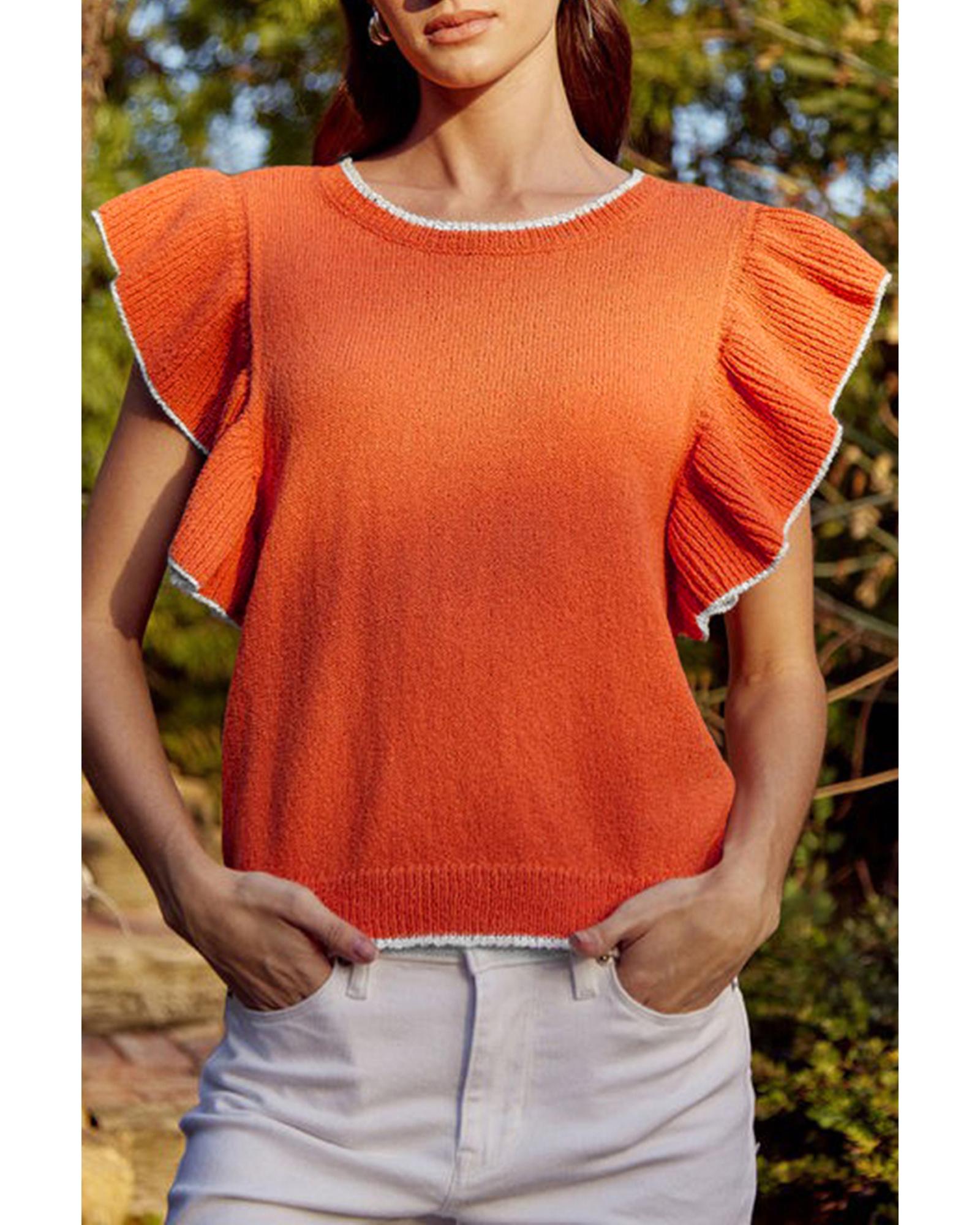 This knitted top features a vibrant russet orange color with contrasting trim and ruffle sleeves, offering a trendy and versatile style suitable for warm days. Designed with a fitted silhouette, it combines comfort and fashion, making it a great addition to your wardrobe.