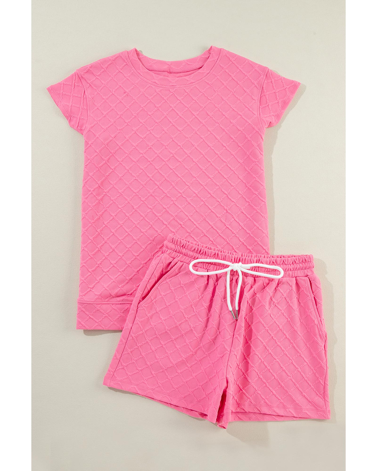 This stylish set features a pink checkered textured tee paired with drawstring shorts, offering a trendy and comfortable look. Designed with a modern fit, it is suitable for casual wear and provides a customizable fit with the drawstring waist. The high elasticity fabric ensures all-day comfort and ease of movement.
