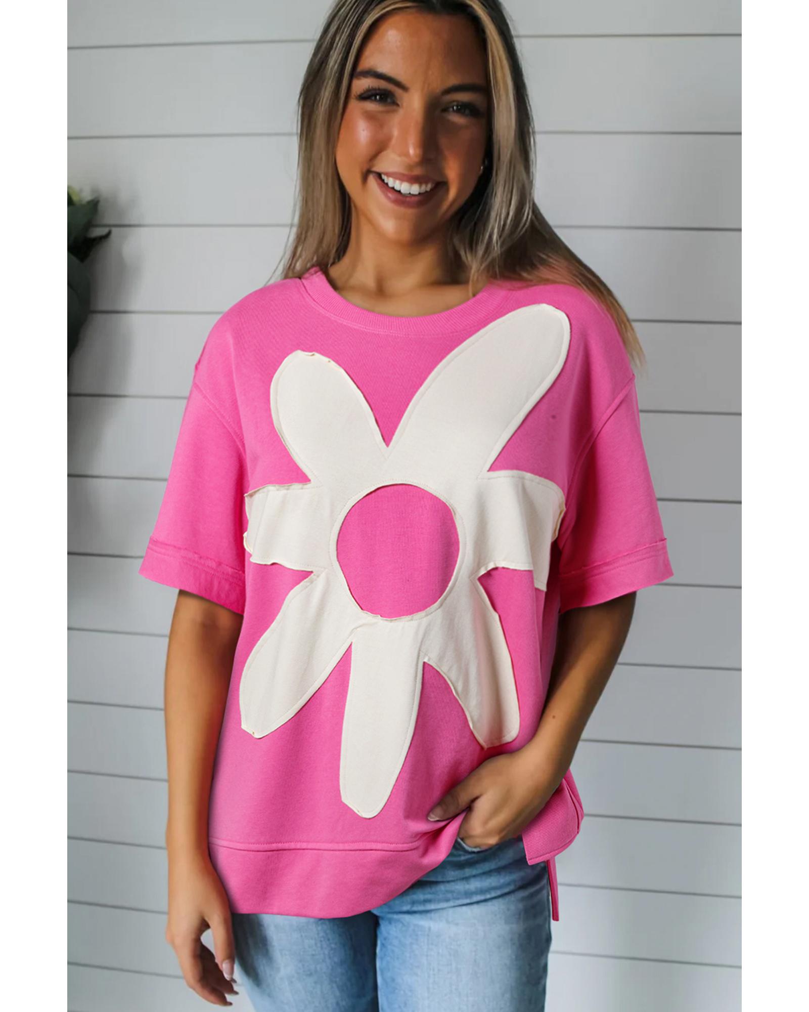 This pink contrast flower drop shoulder loose T-shirt offers a relaxed and stylish look with its comfortable fit and charming floral pattern. Designed with a drop shoulder style and short sleeves, it provides a breezy and effortless wearing experience suitable for casual occasions.