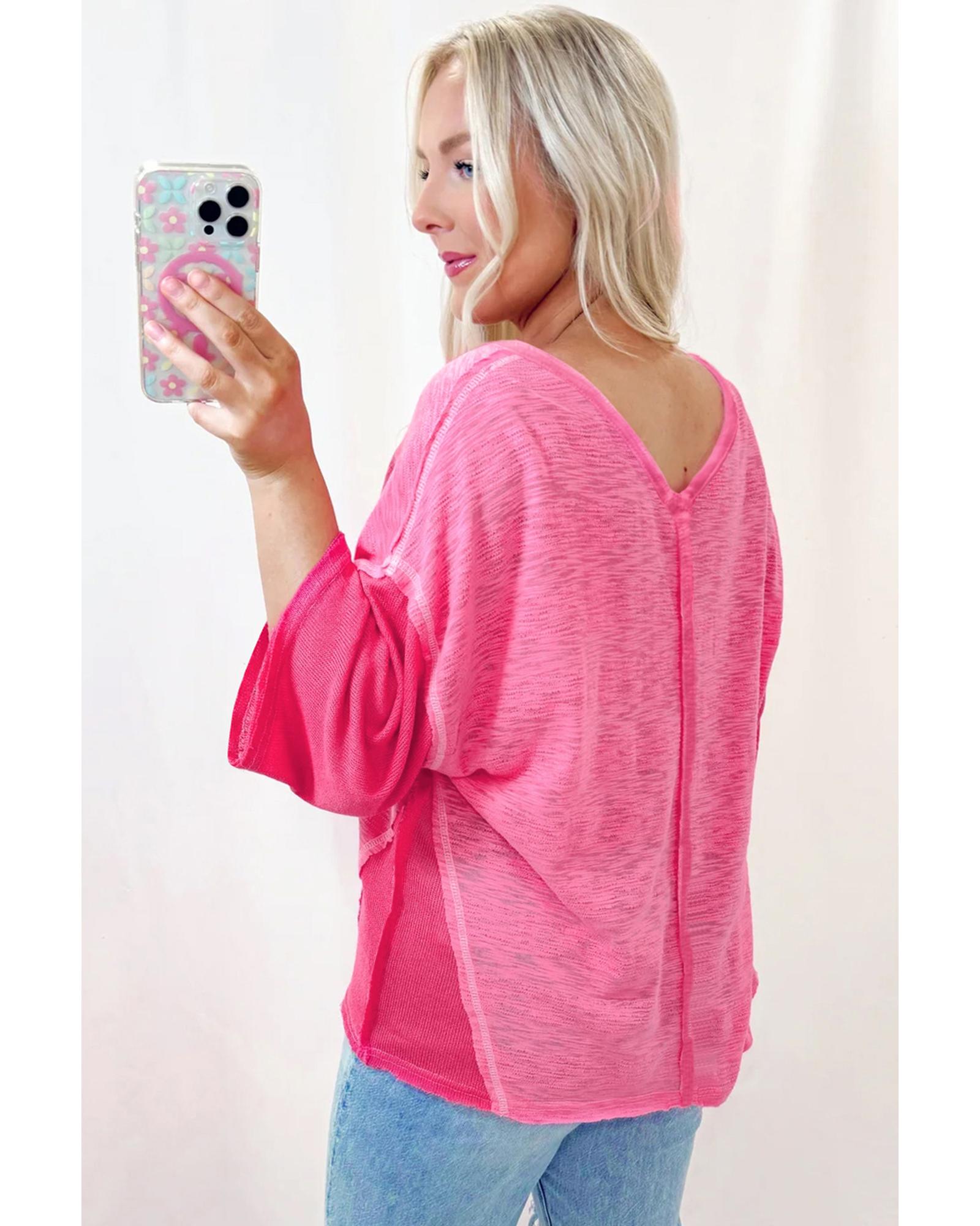 Sachet Pink Contrast Patchwork 3/4 Sleeve V Neck Loose Blouse – S