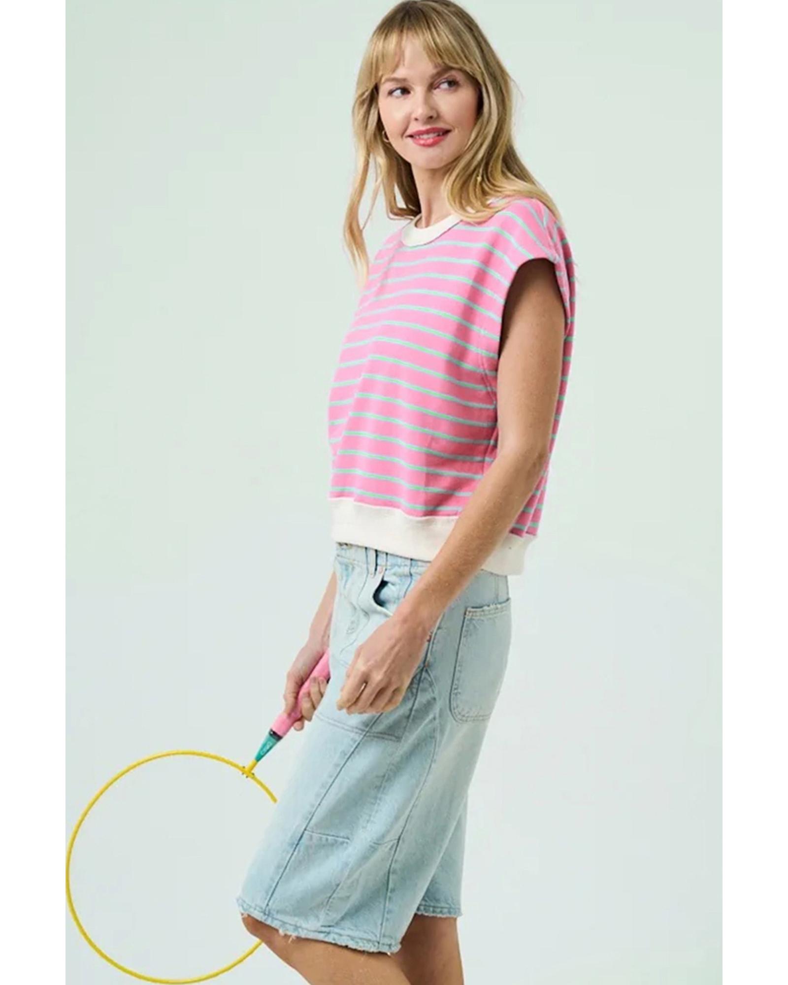 Sachet Pink Striped Crew Neck Cap Sleeve T Shirt – M