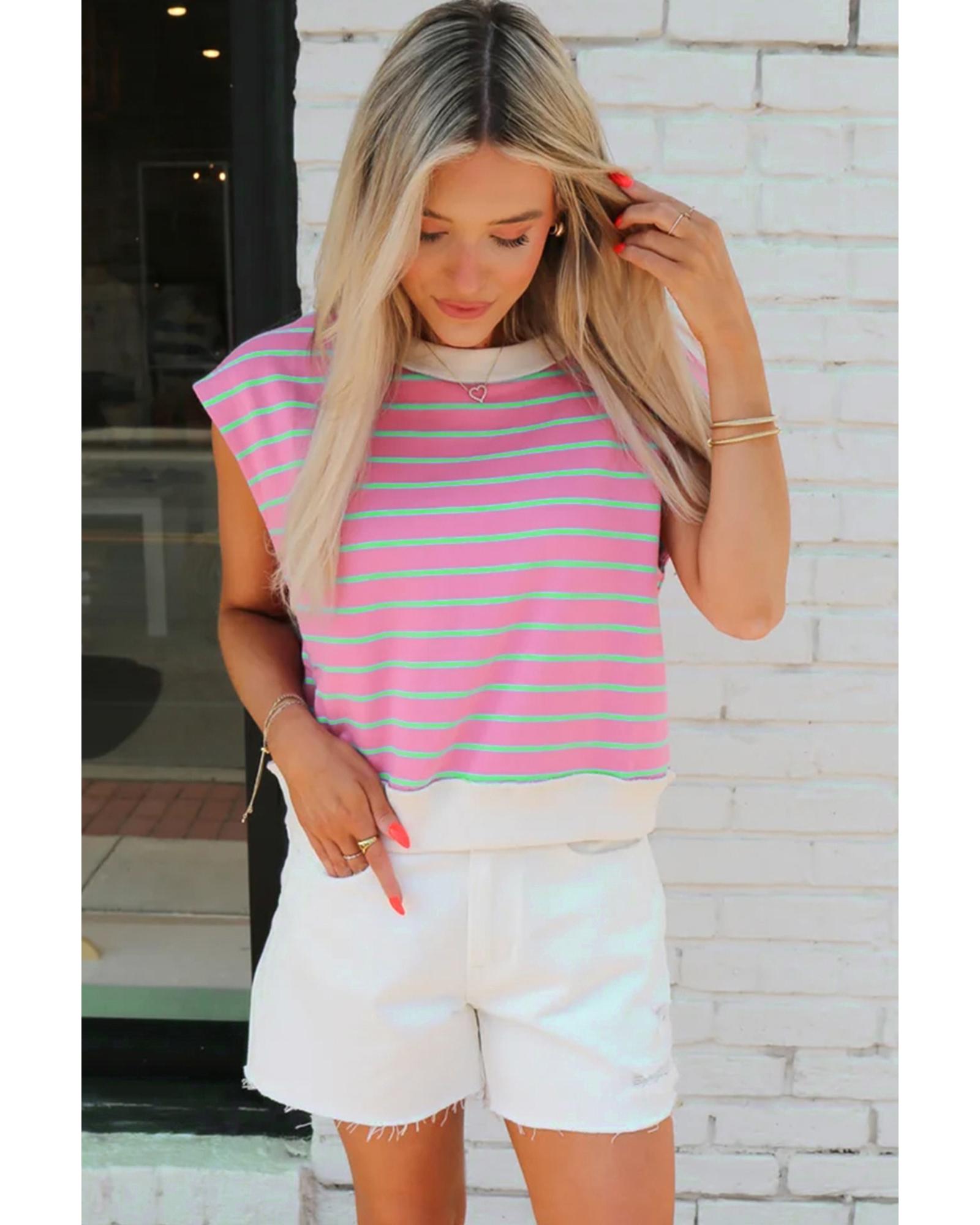This stylish crew neck cap sleeve t-shirt features a pink striped design, perfect for casual wear. It is tailored for a flattering fit and made from high-quality materials, ensuring comfort and durability.