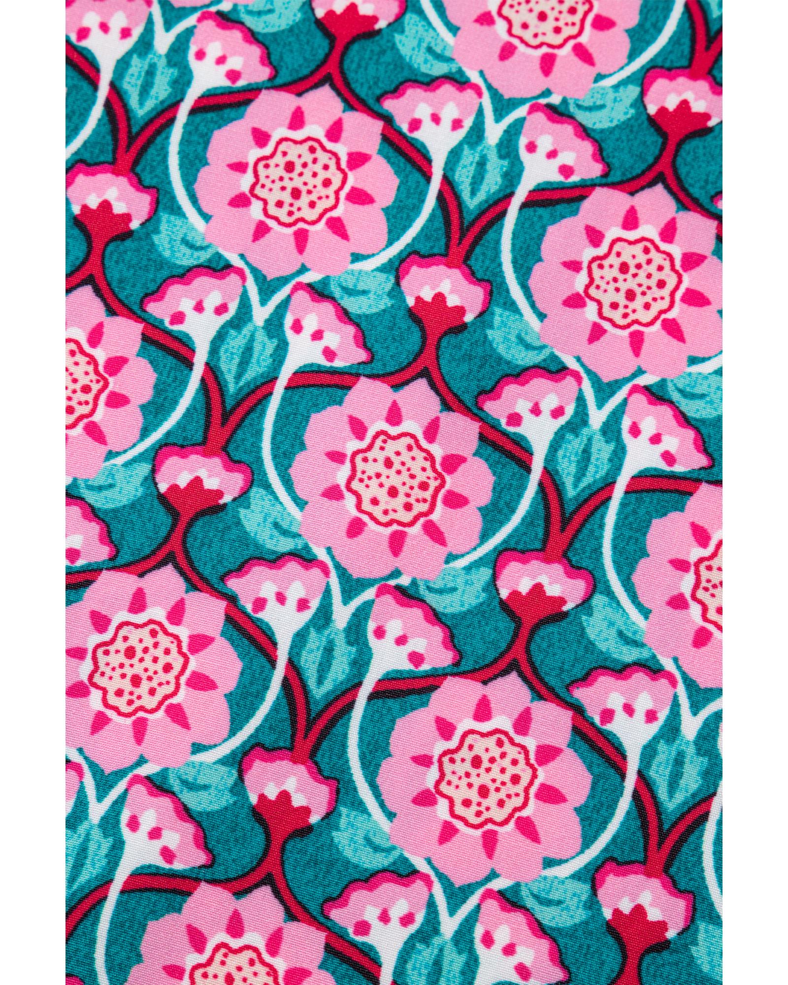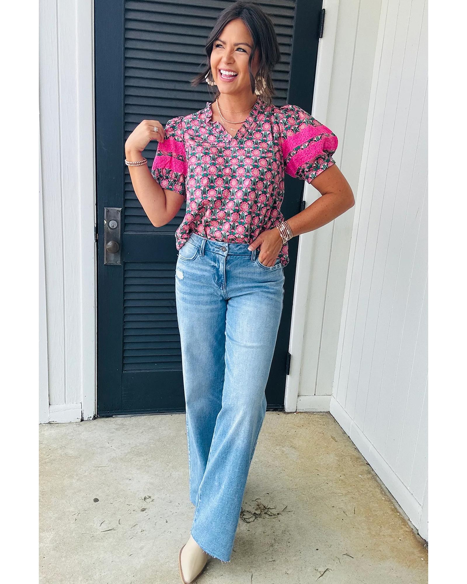 This stylish pink V-neck top features a ruffle detail and an abstract floral print, making it a vibrant addition to any wardrobe. The unique puff sleeves add a fashionable touch, while the comfortable fit ensures ease of wear. Perfect for casual or semi-formal occasions, this top combines eye-catching design with comfort.