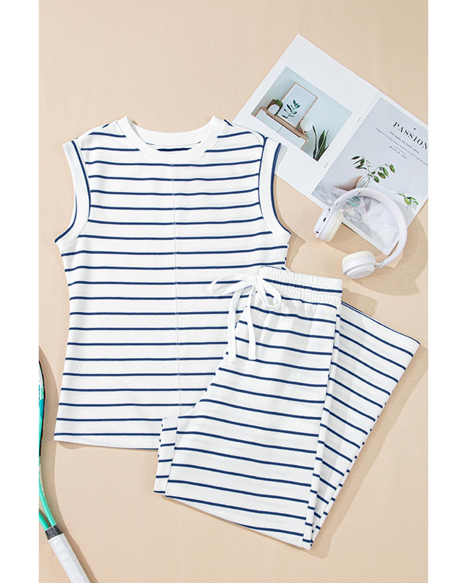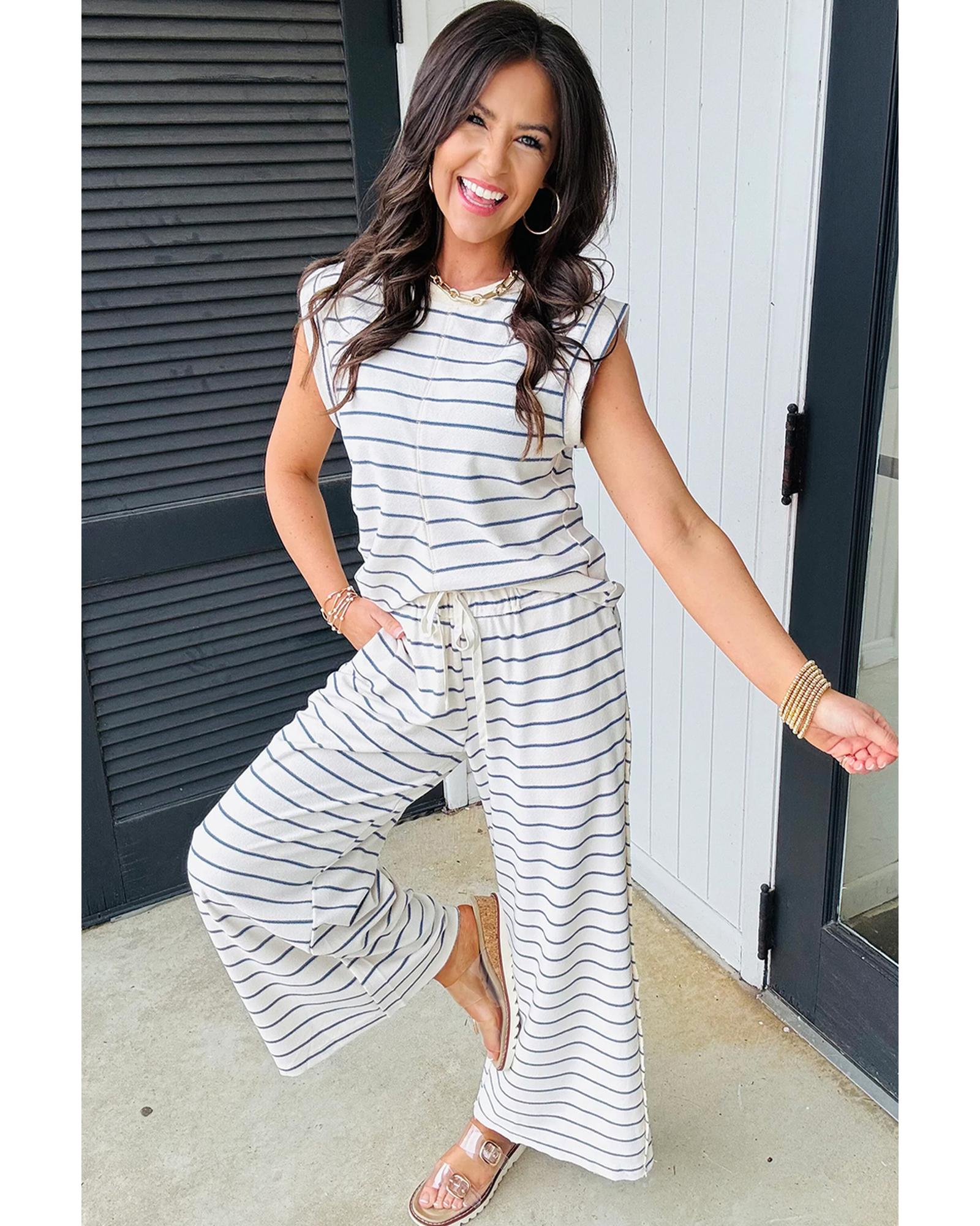 This casual wide-leg pants set in a stylish blue color offers a comfortable and modern look. The set includes a sleeveless top with a cap design and matching wide-leg pants, making it suitable for everyday wear. Crafted from soft, breathable fabric, it ensures all-day comfort, especially during hot weather. Perfect for pairing with sandals or sneakers for a complete, relaxed outfit.
