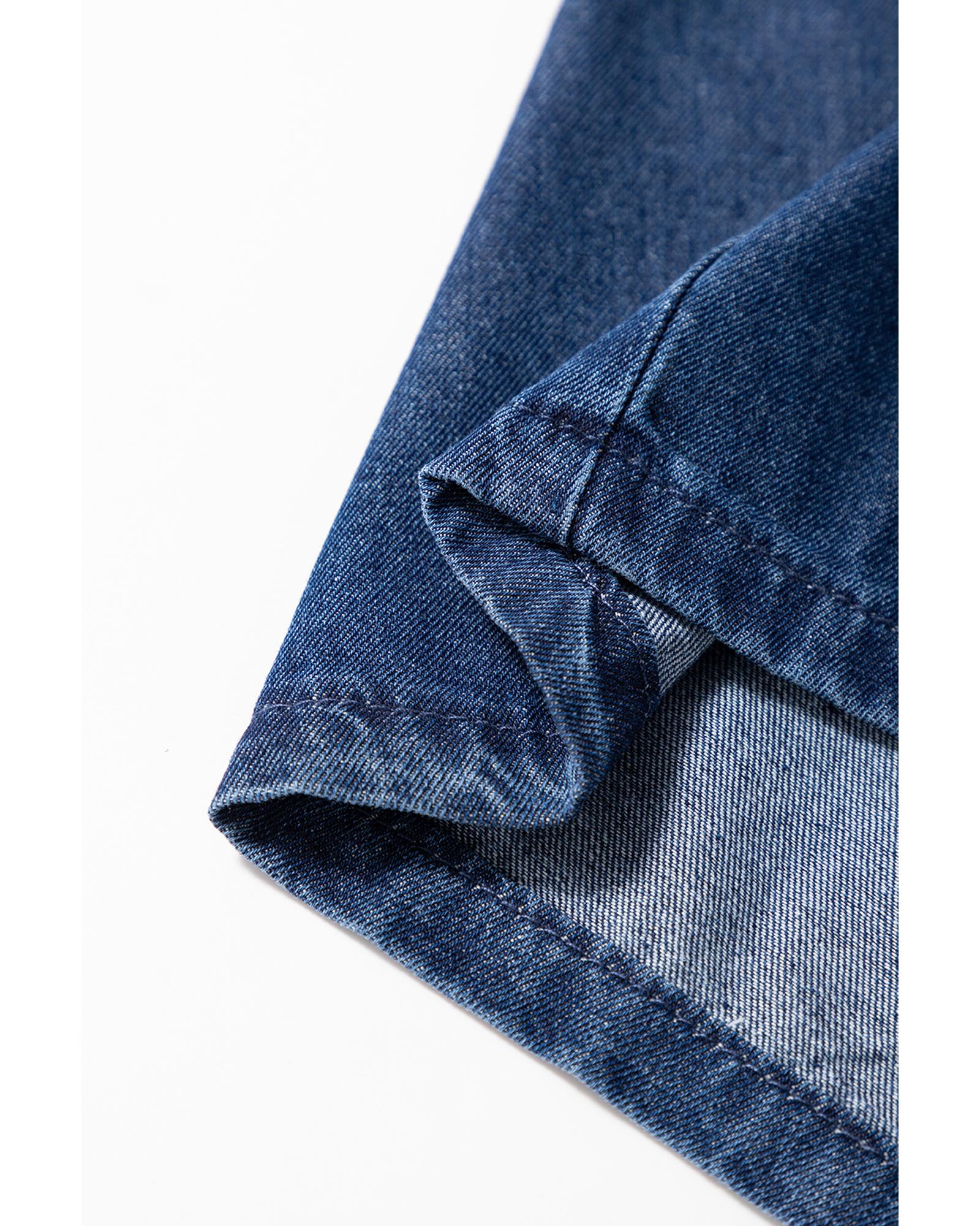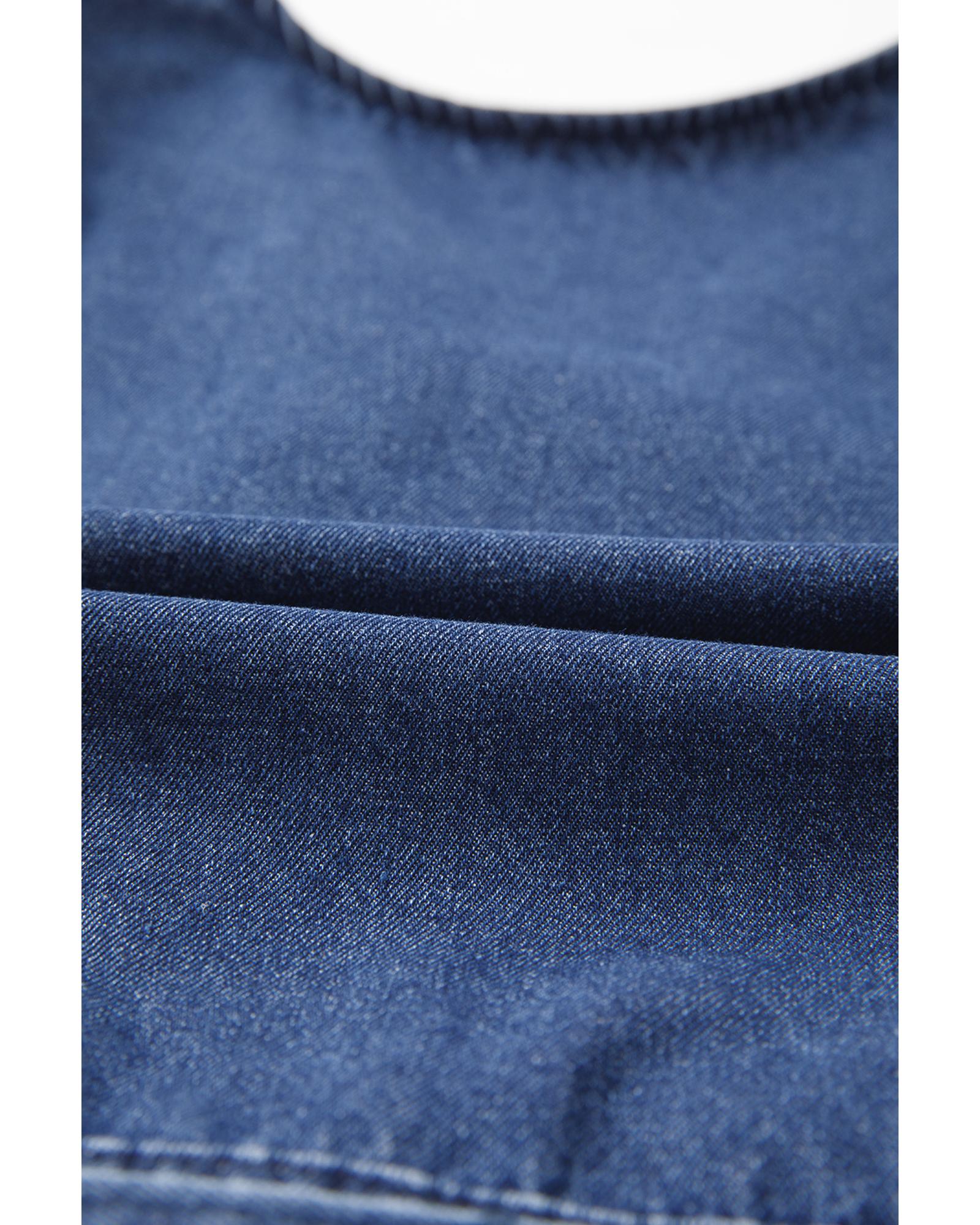 This denim romper features a stylish ruffled design with a convenient front zipper and a belted waist, creating a trendy and flattering silhouette. Made from durable and comfortable denim fabric, it is suitable for various occasions and offers a fashionable look.